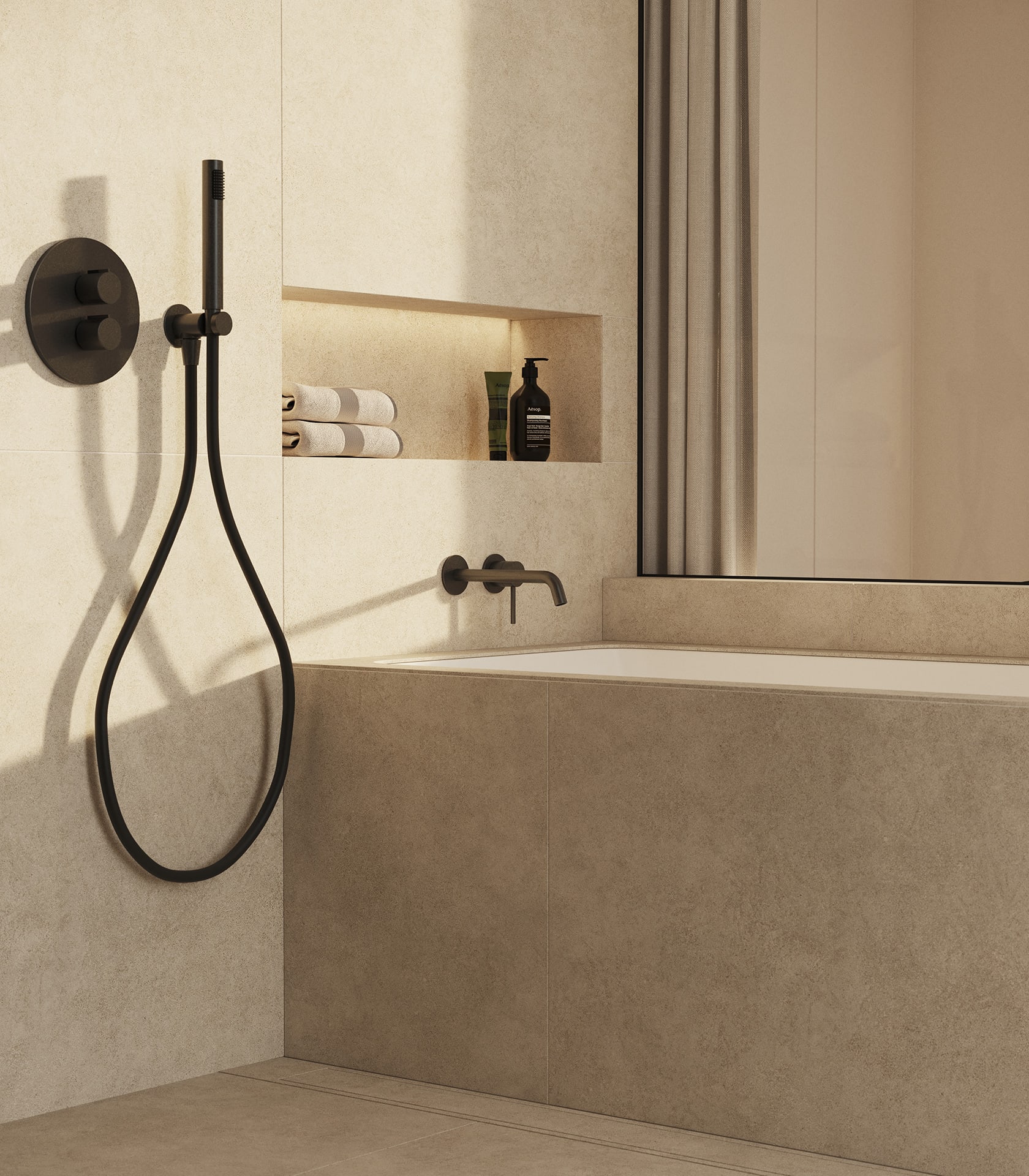 La planta principal de la vivienda asume un papel dual: combina la solidez de la tierra con una sutil sensación de ingravidez, dando la impresión de flotar con naturalidad sobre el terreno. Esta elevación intencionada abre la casa al horizonte, enmarcando a través de grandes ventanales el paisaje pintoresco que se extiende hasta un arroyo que serpentea y acompaña delicadamente los límites de la parcela.
