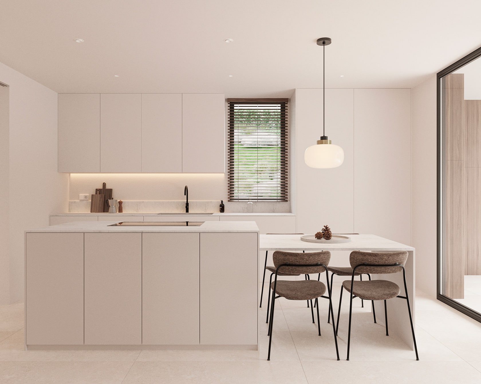 Las áreas comunes orbitan en torno al patio central, y cada espacio se funde sin esfuerzo con el siguiente. La luz natural inunda el interior desde el propio patio, generando una atmósfera que diluye la frontera entre el interior y el exterior.