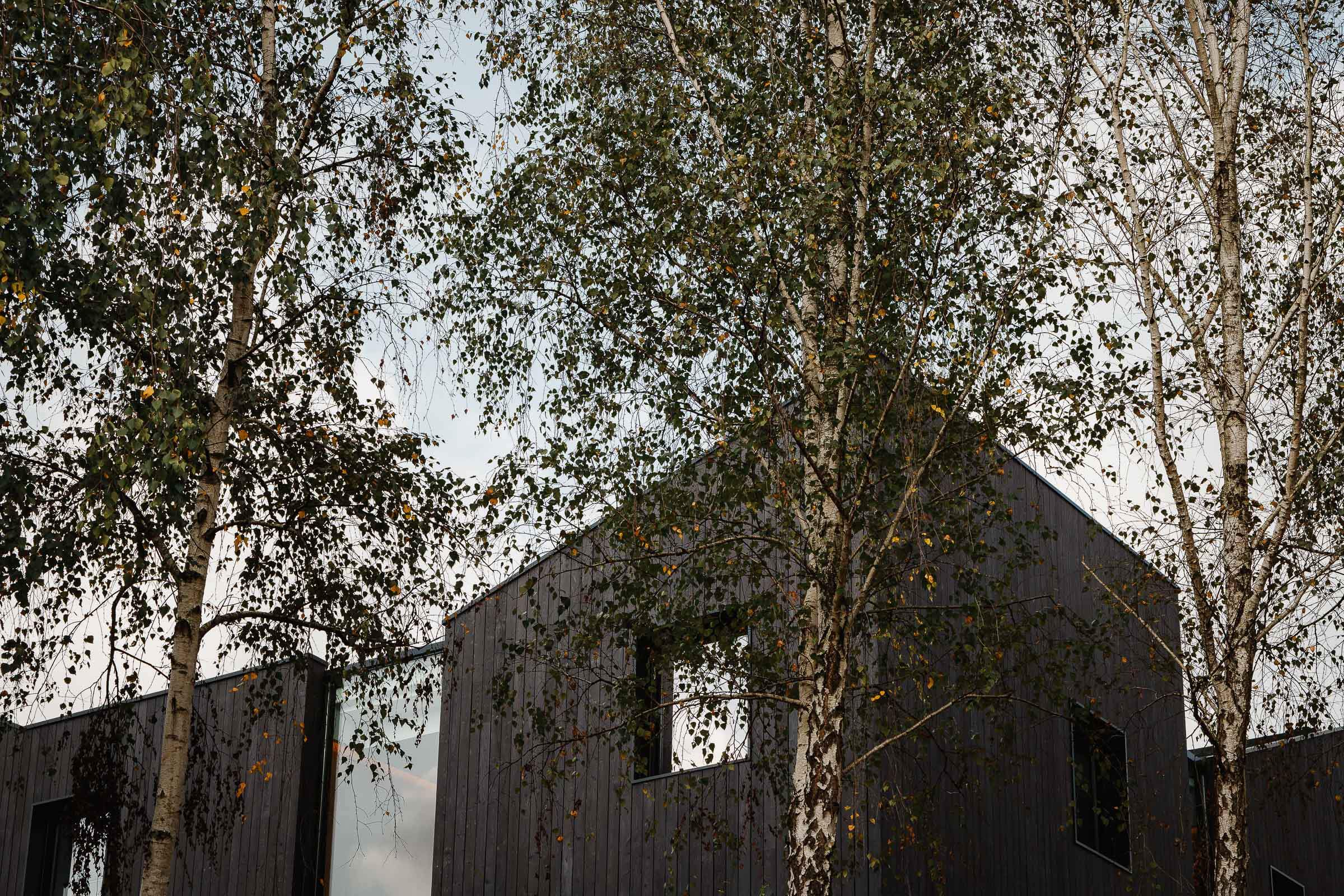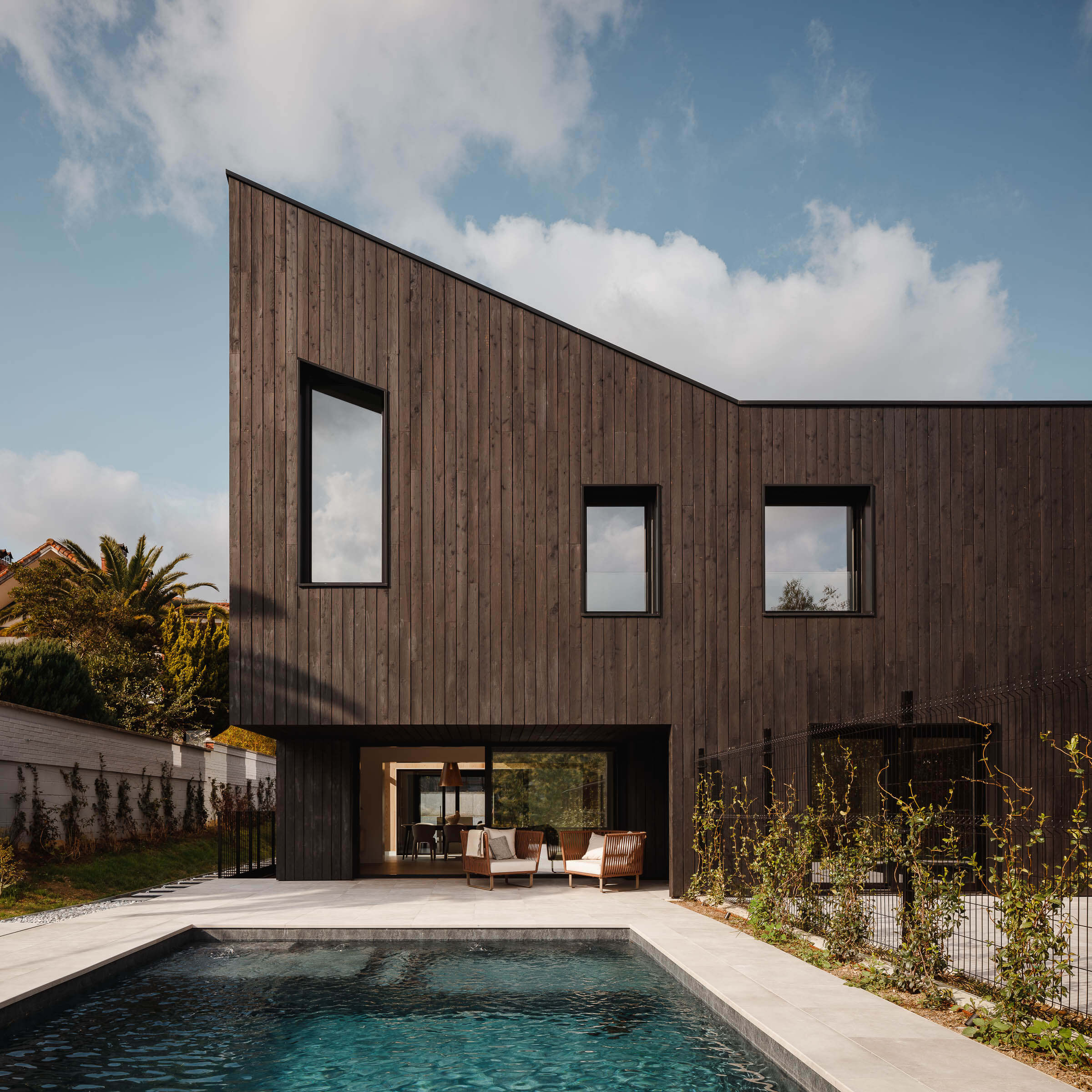 El CLT nos permite trabajar con un material renovable que captura CO₂, reduce el impacto ambiental y mejora el rendimiento térmico, además de ofrecer una construcción rápida, precisa y eficiente. La técnica japonesa Yakisugi, por su parte, protege la madera de forma natural frente al fuego, la humedad y el paso del tiempo, sin necesidad de tratamientos químicos, y refuerza la identidad contemporánea del conjunto.