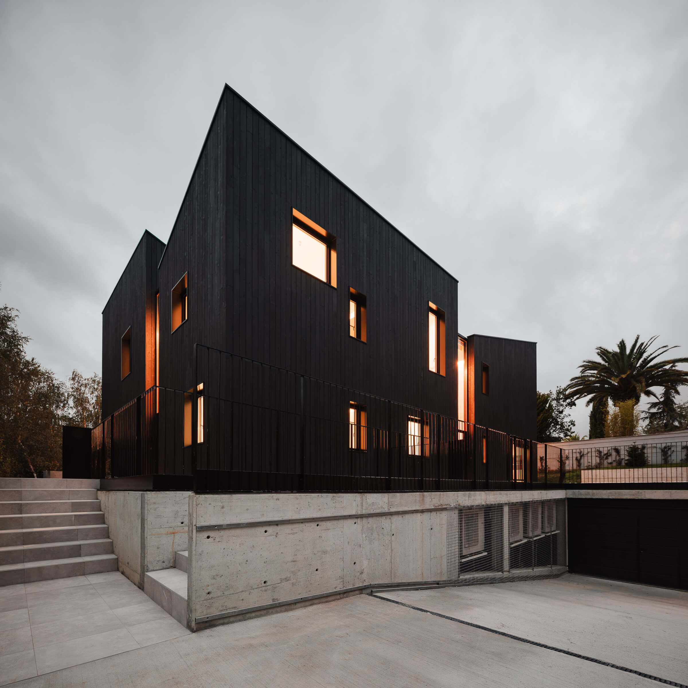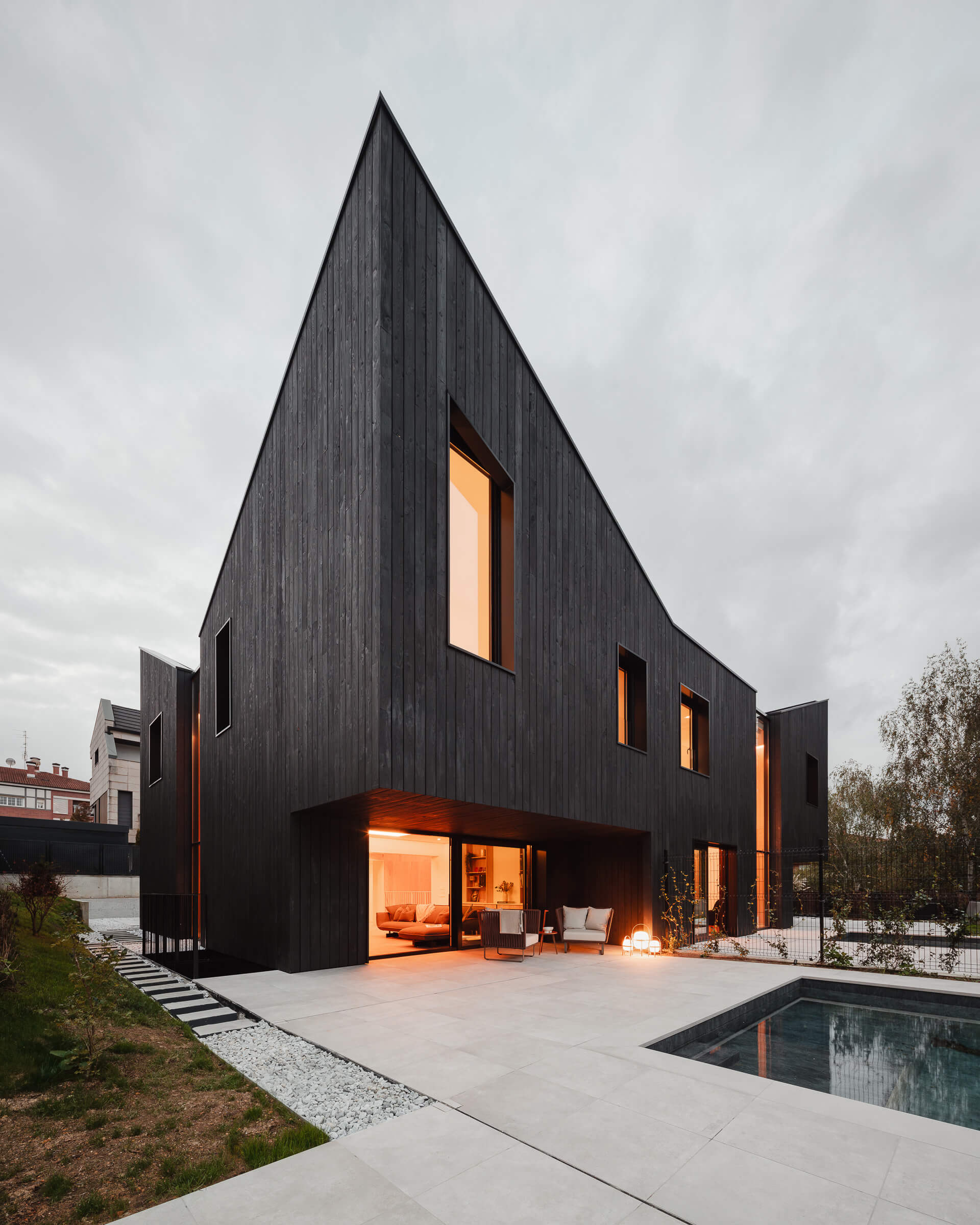 En este proyecto reinterpretamos la tradición constructiva local en madera desde una mirada contemporánea y sostenible. Diseñamos una vivienda bifamiliar de 910 m² construida íntegramente con madera contralaminada (CLT) y revestida con alerce carbonizado trabajado mediante la técnica japonesa Yakisugi (Shou Sugi Ban). Un proyecto que entiende el vacío como lujo y la luz como material arquitectónico.