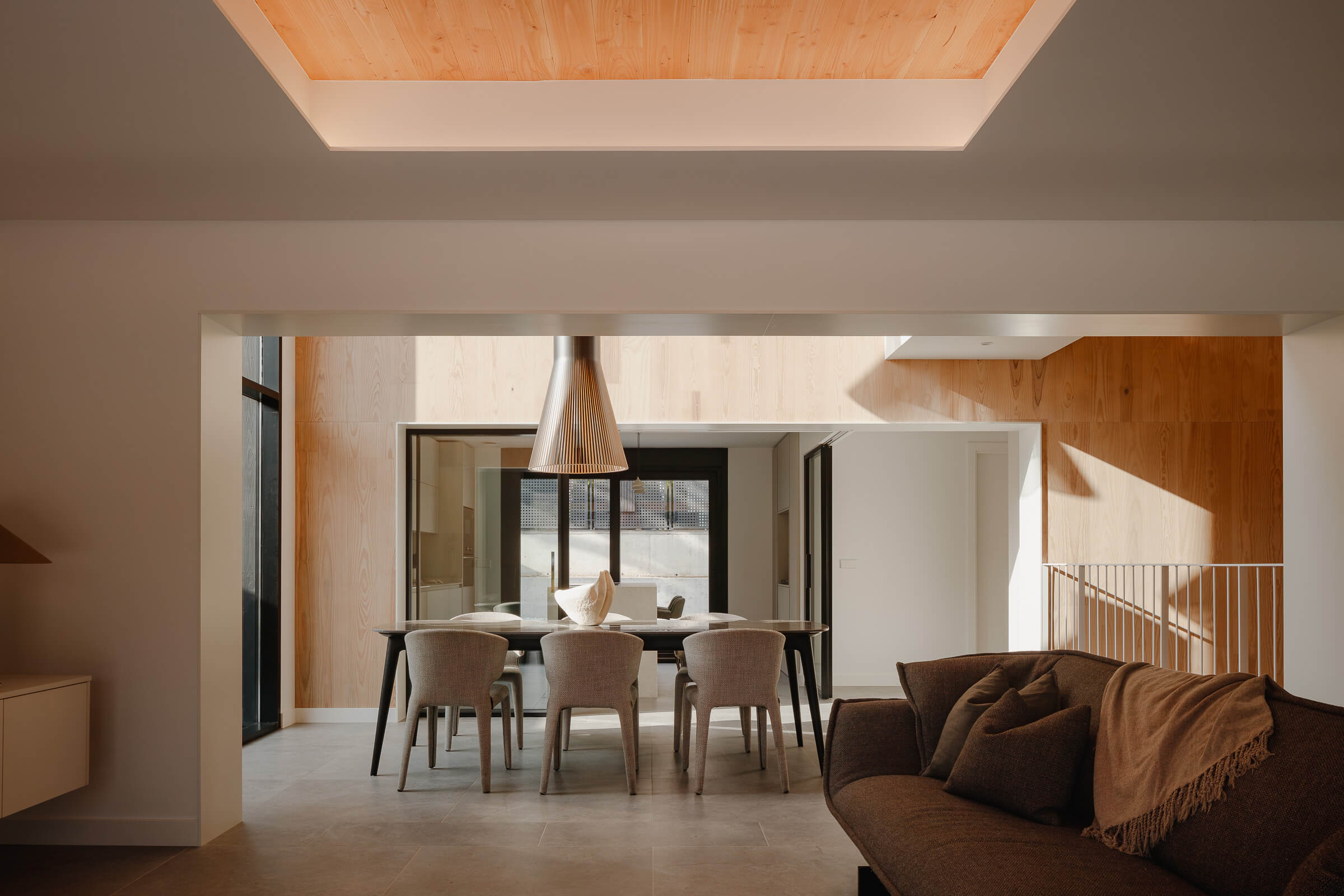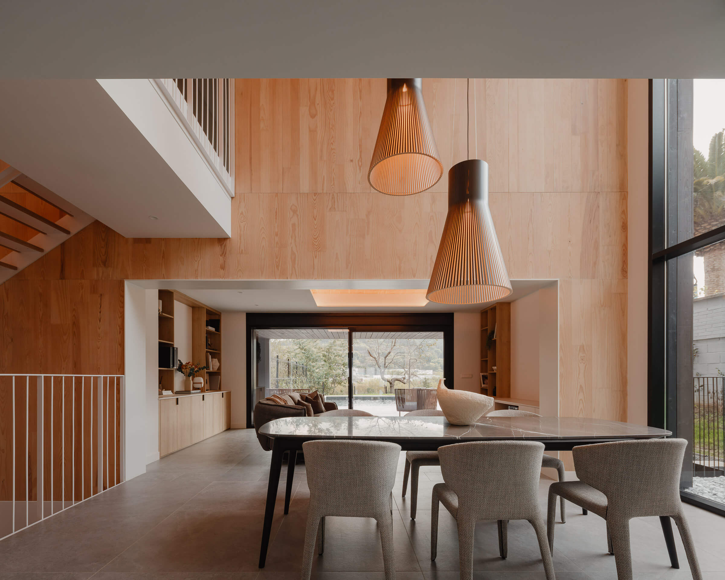 La propia estrategia constructiva se convierte en expresión estética. La volumetría se fragmenta en cuatro cuerpos de cubierta inclinada que rodean un volumen central de cubierta plana, generando un juego de ritmos y alturas que dialoga con la topografía. La luz cenital y los grandes huecos en fachada estructuran la vida interior, acompañando el ritmo del día.