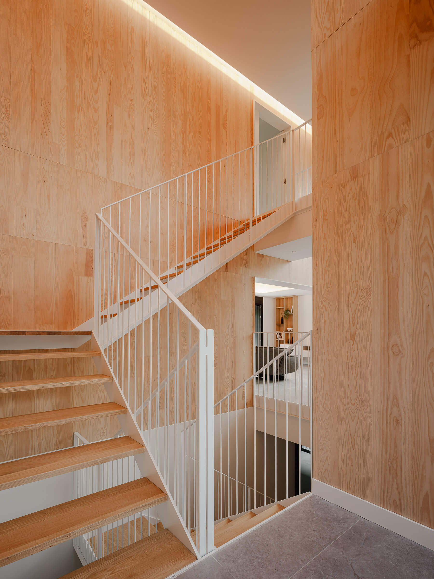 Las dos viviendas se organizan en volúmenes en forma de “L” que definen tanto el espacio exterior como la distribución interior. Dos líneas contundentes atraviesan el edificio generando dobles y triples alturas que conectan visualmente las distintas plantas y proyectan las viviendas hacia el paisaje. Estas grietas de luz desdibujan los límites entre interior y exterior, creando una experiencia espacial en la que la arquitectura se siente más que se mira.