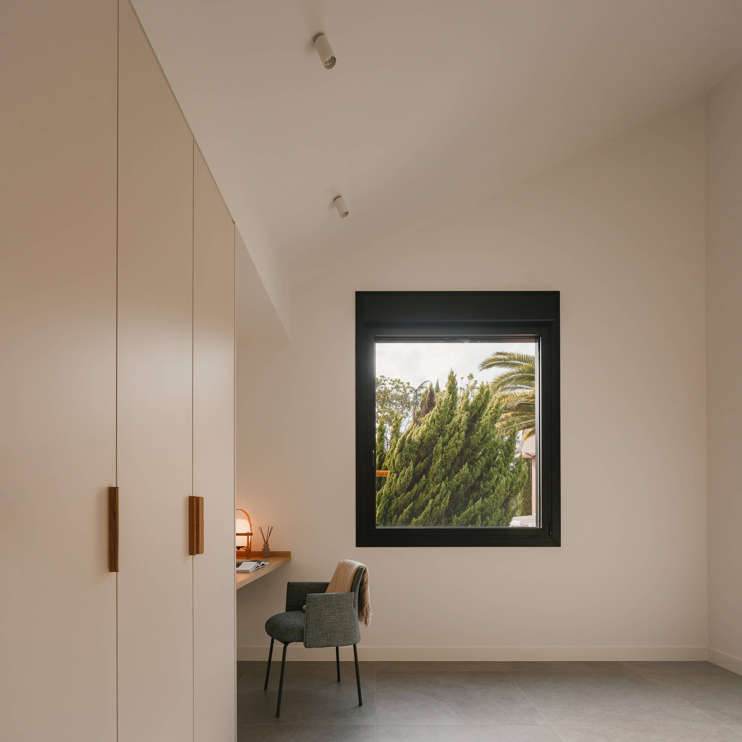La estructura de madera contralaminada (CLT) además de sostener el edificio, aparece desnuda en gran parte del proyecto mostrándose con honestidad, siendo visible tanto en el interior como en el exterior. En el interior es la protagonista, especialmente en las zonas de comunicación vertical como las escaleras, donde actúa como columna vertebral del proyecto y refuerza la continuidad entre niveles. La madera en su versión natural de veta continua aporta calidez a las estancias a través de techos, muros y escaleras. La luz cenital suaviza las superficies, modulando la temperatura visual del espacio. Los tonos neutros y materiales nobles completan una atmósfera serena y contemporánea, en coherencia con la arquitectura exterior.