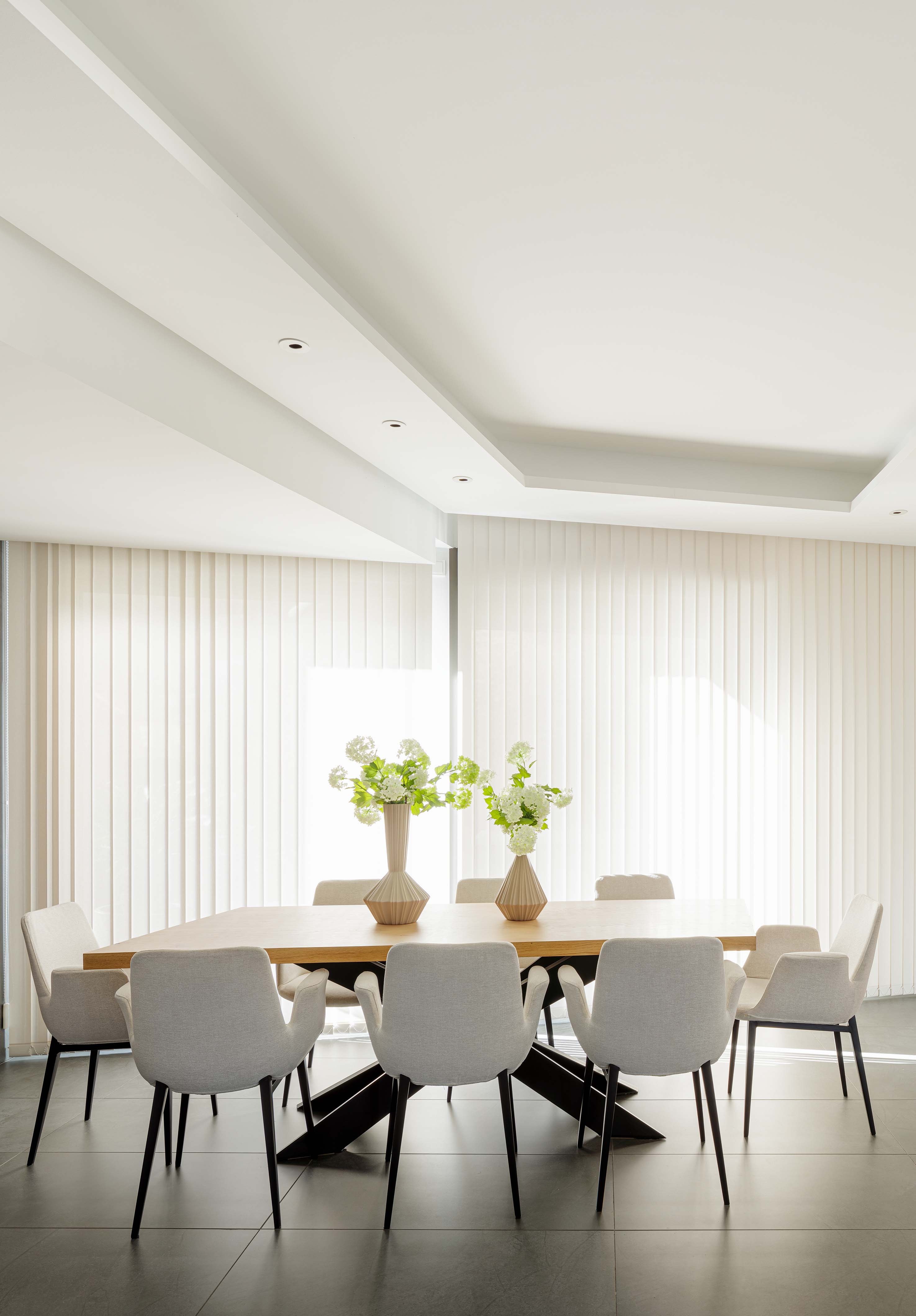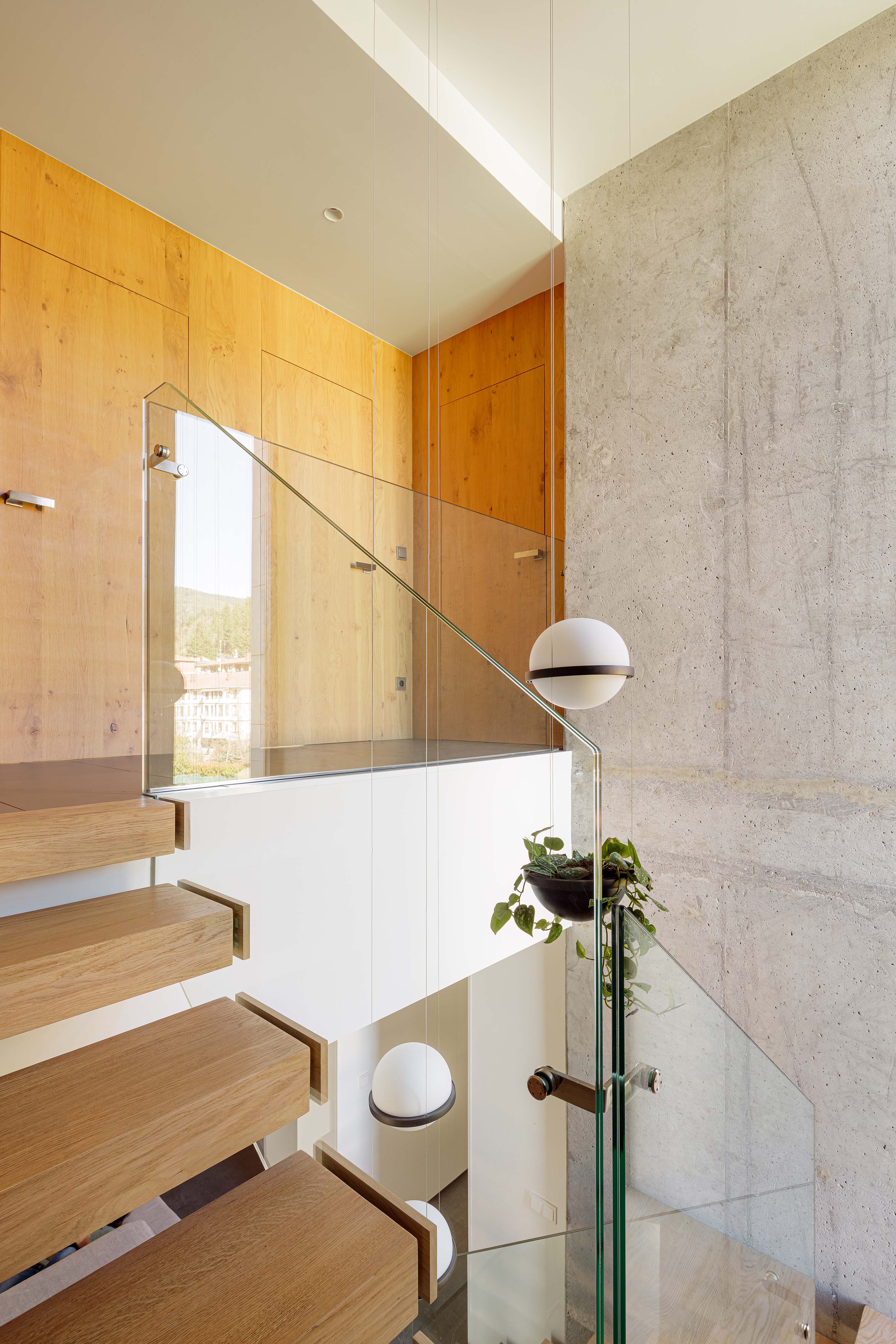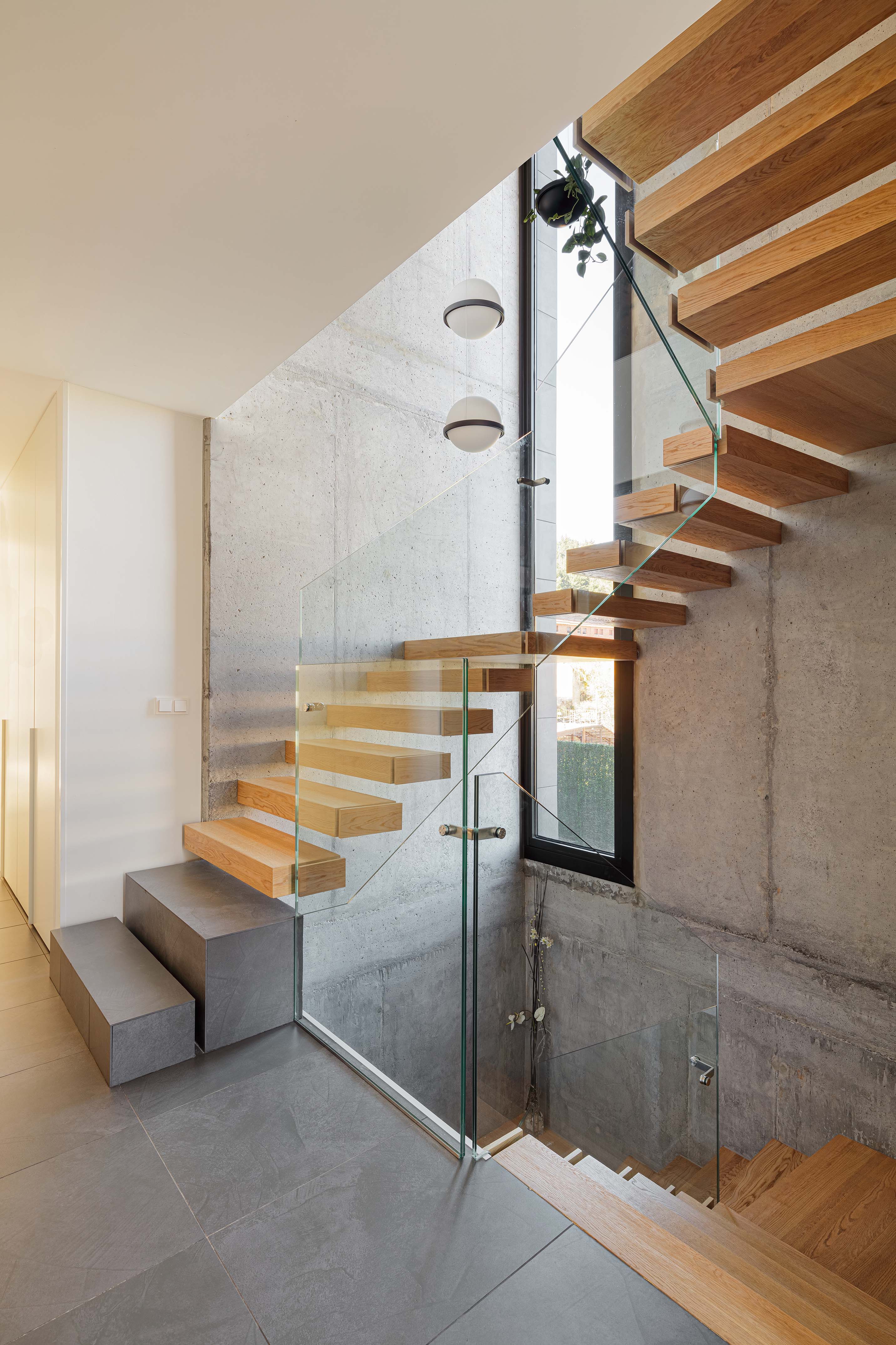 A partially underground basement serves as the base for the two floors that make up the living spaces. The ground floor features day rooms such as the kitchen, dining room, and living room while the upper floor is reserved for the more intimate and evening uses of the home. These three floors are united in one magnificent triple height room where the main staircase presides.