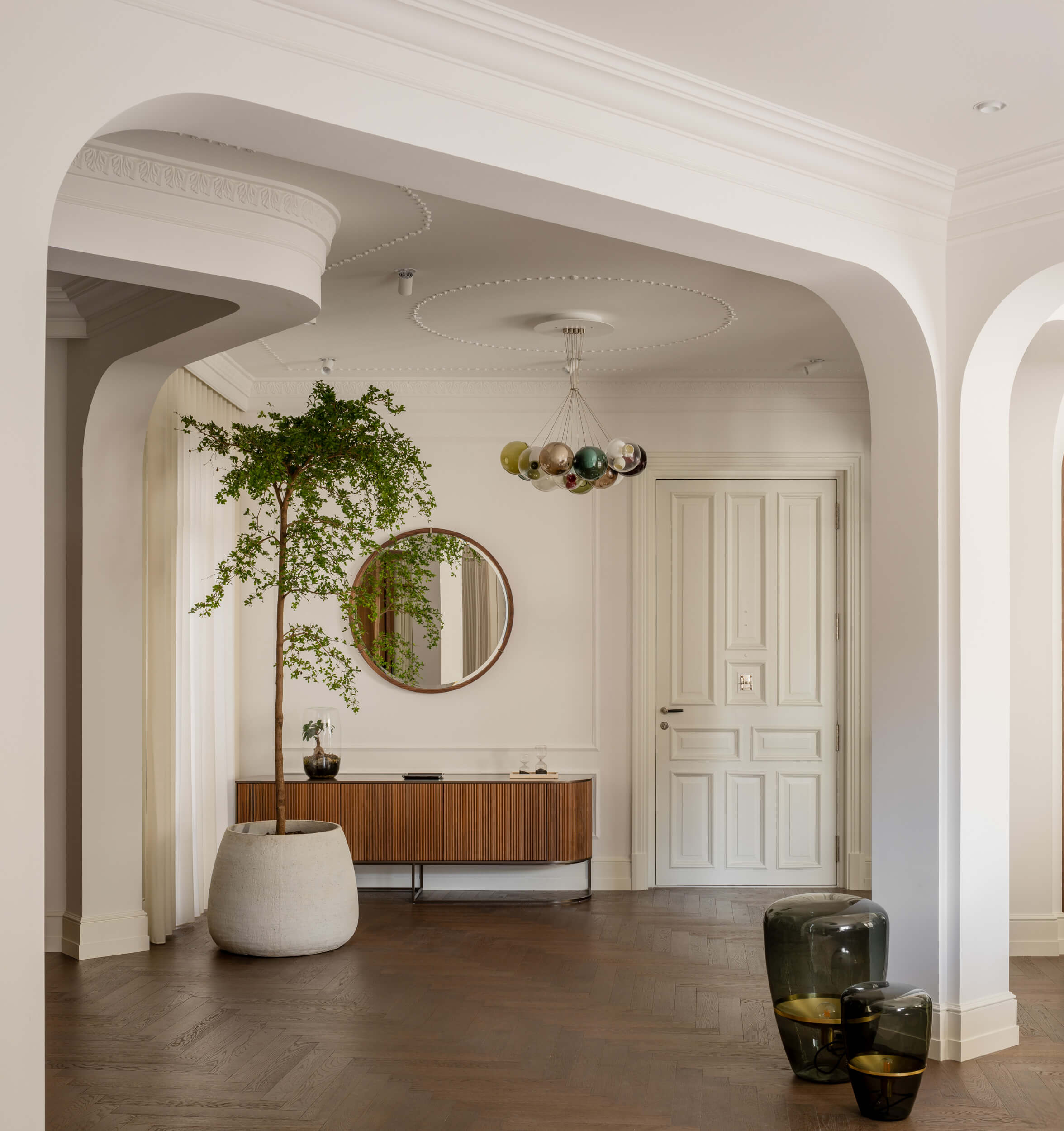 The residence opens through a hall conceived as an introduction to the project. A sculptural Bocci 28.13 lamp, composed of spheres in reddish, bottle-green, and Bilbao-blue tones, greets visitors and unfolds the color palette that nuances each room. Arches organize circulation and reinforce the connection between spaces, while restored mouldings coexist with signature pieces such as the Dune sideboard and the Levante mirror by Bonaldo. The social core of the residence unfolds in a living room flooded with natural light, where large windows frame urban life and the reflections of mirrors and stained glass multiply the perception of space. The neutral palette is interrupted by a red Ditre sofa, a sculptural gesture that defines the identity of the space.