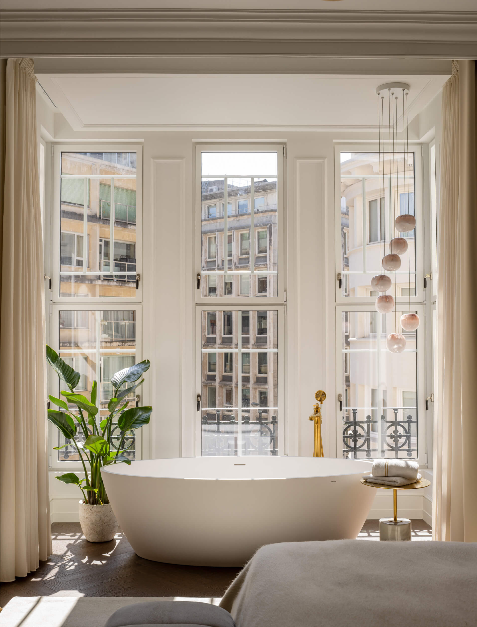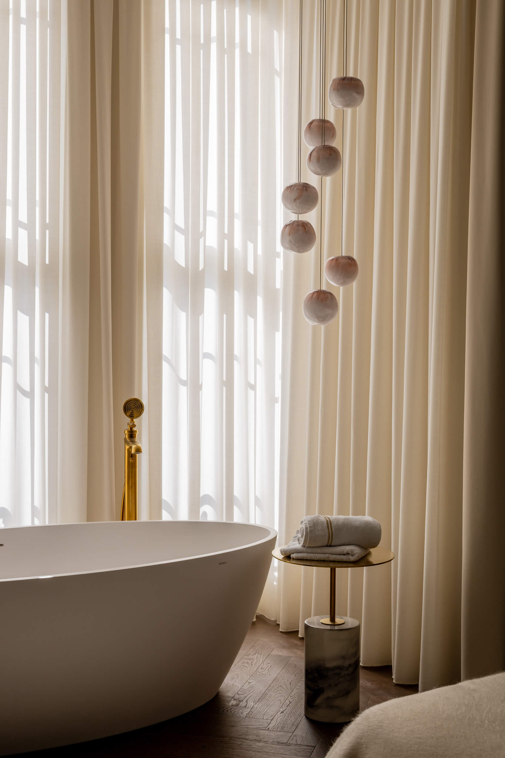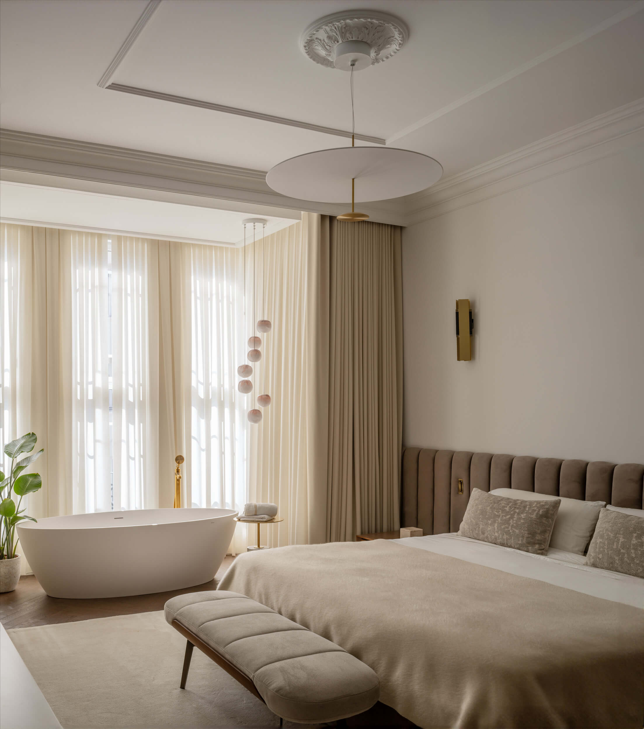 Fluid continuity leads to the dining room, where a Cattelan table takes center stage beneath Bocci’s 57.13 lamp—abstract, poetic, and conceived almost as an art installation. The dining room connects to the kitchen through curved wood-and-glass carpentry that reinterprets traditional partitions. Presided over by a central island and accompanied by green-upholstered chairs, the space invites cooking, conversation, and sharing. Lighting is completed with Marset’s Ambrosia lamp. In the private area, the master bedroom is designed as a retreat. Sandy-toned textiles, an upholstered headboard, and a freestanding bathtub by the windows transform the everyday into a ritual of wellbeing. The en-suite bathroom reinforces this atmosphere with a block of dark marble veined with gold and Steinberg fixtures.