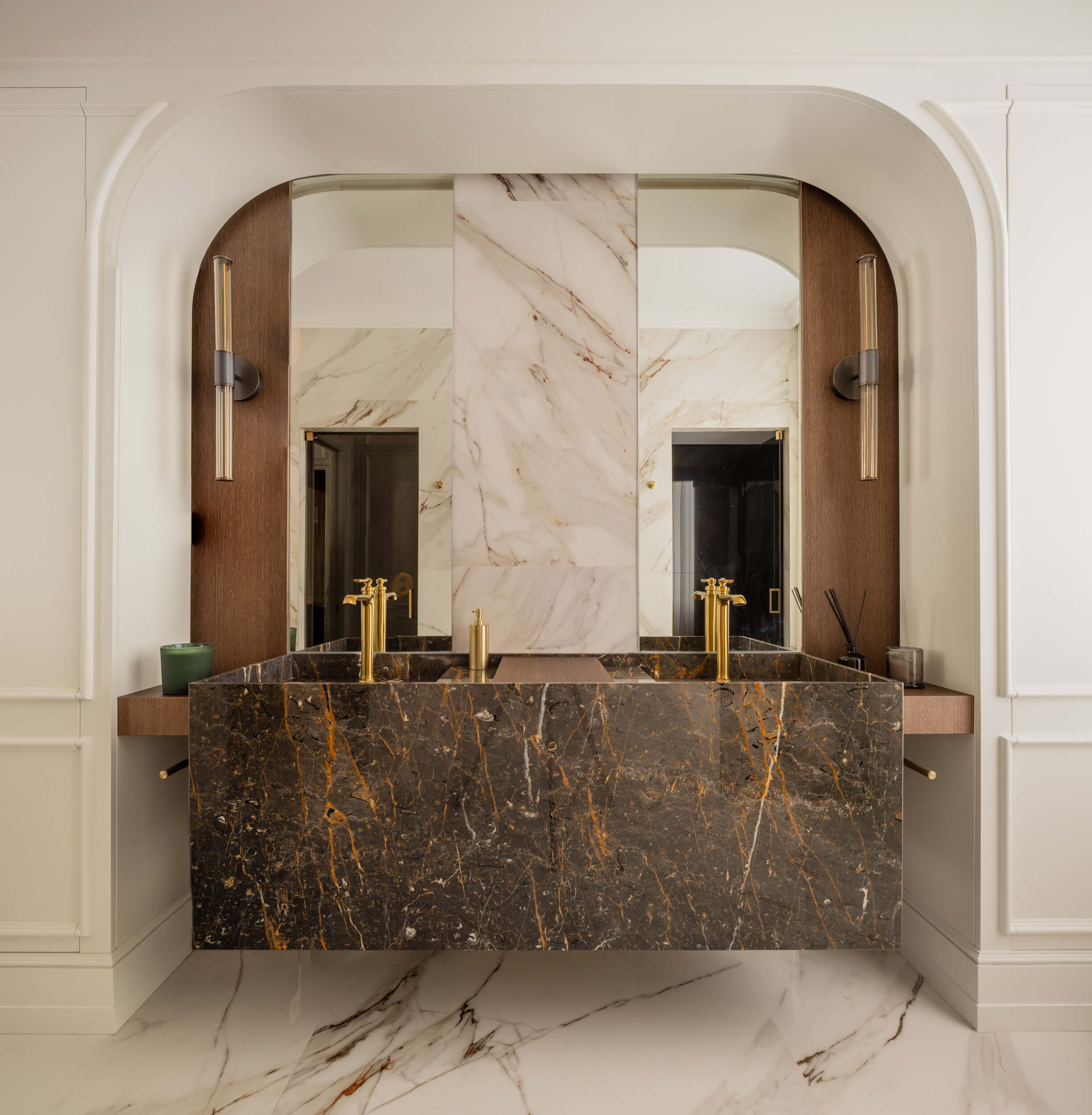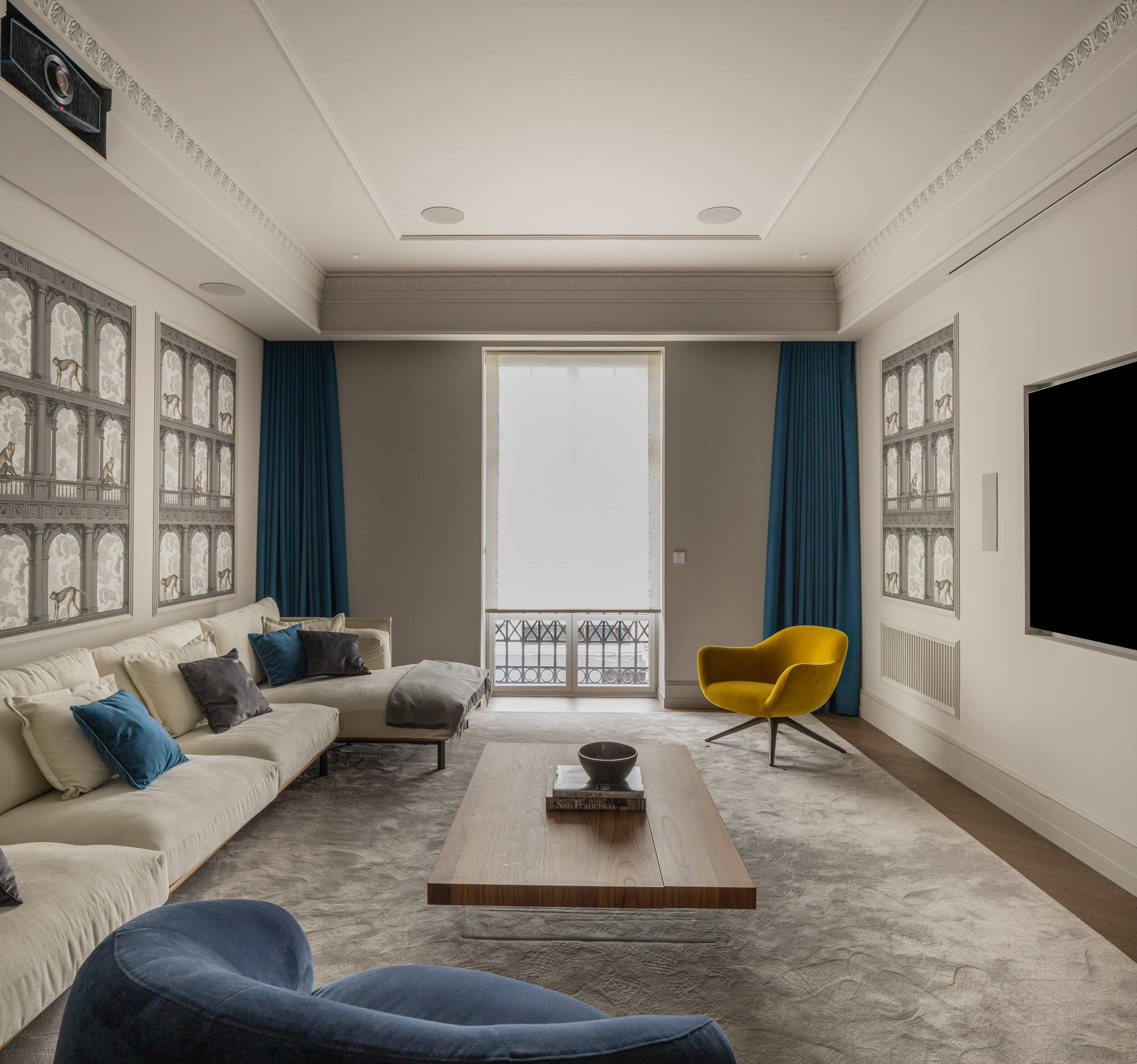 The residence is conceived as two homes in one. The first, designed for daily life, integrates the living room, dining room, kitchen, and master suite. The second, created for family living, includes bedrooms with independent bathrooms, ensuring privacy and autonomy. The journey culminates in a private home cinema, equipped with a large-format screen, audiovisual system, auxiliary kitchen, and backlit bar. Wallpaper by Cole & Son, depicting classical façades inhabited by animals, introduces a playful touch.