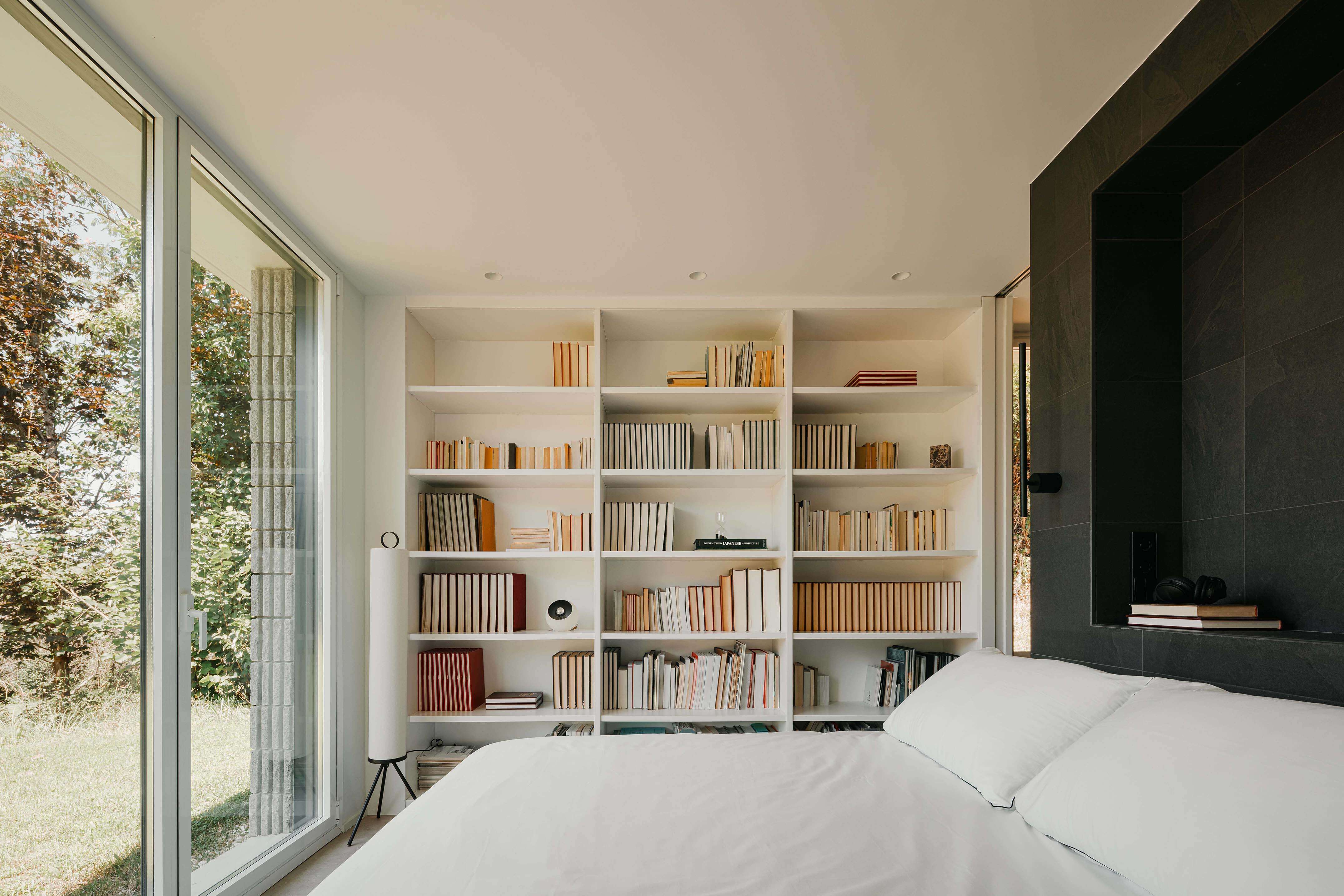 the outside, like a burrow, it hides, while opening up to the landscape and light.