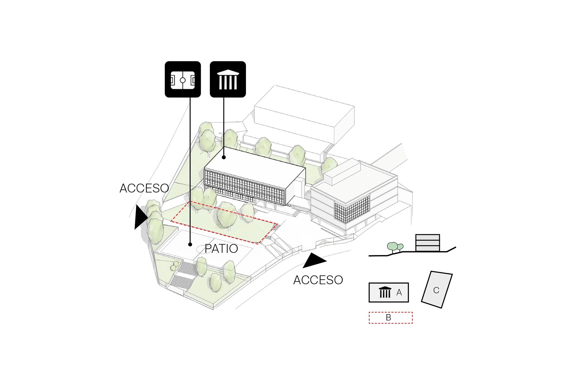 En la parcela se identifican cuatro plataformas con distintos accesos y usos. La primera acoge el patio principal; la segunda, el edificio actual de Primaria y el gimnasio; mientras que la tercera y cuarta plataformas corresponden a la Escuela Secundaria y quedan fuera del ámbito de actuación.