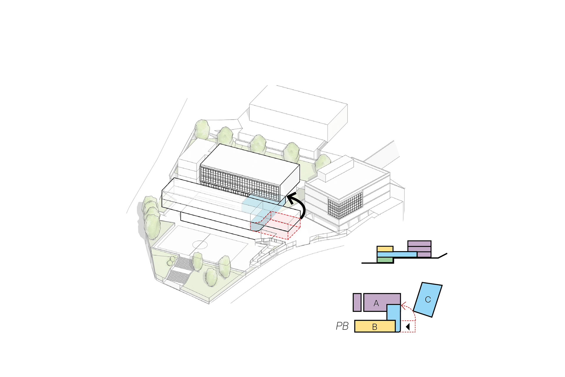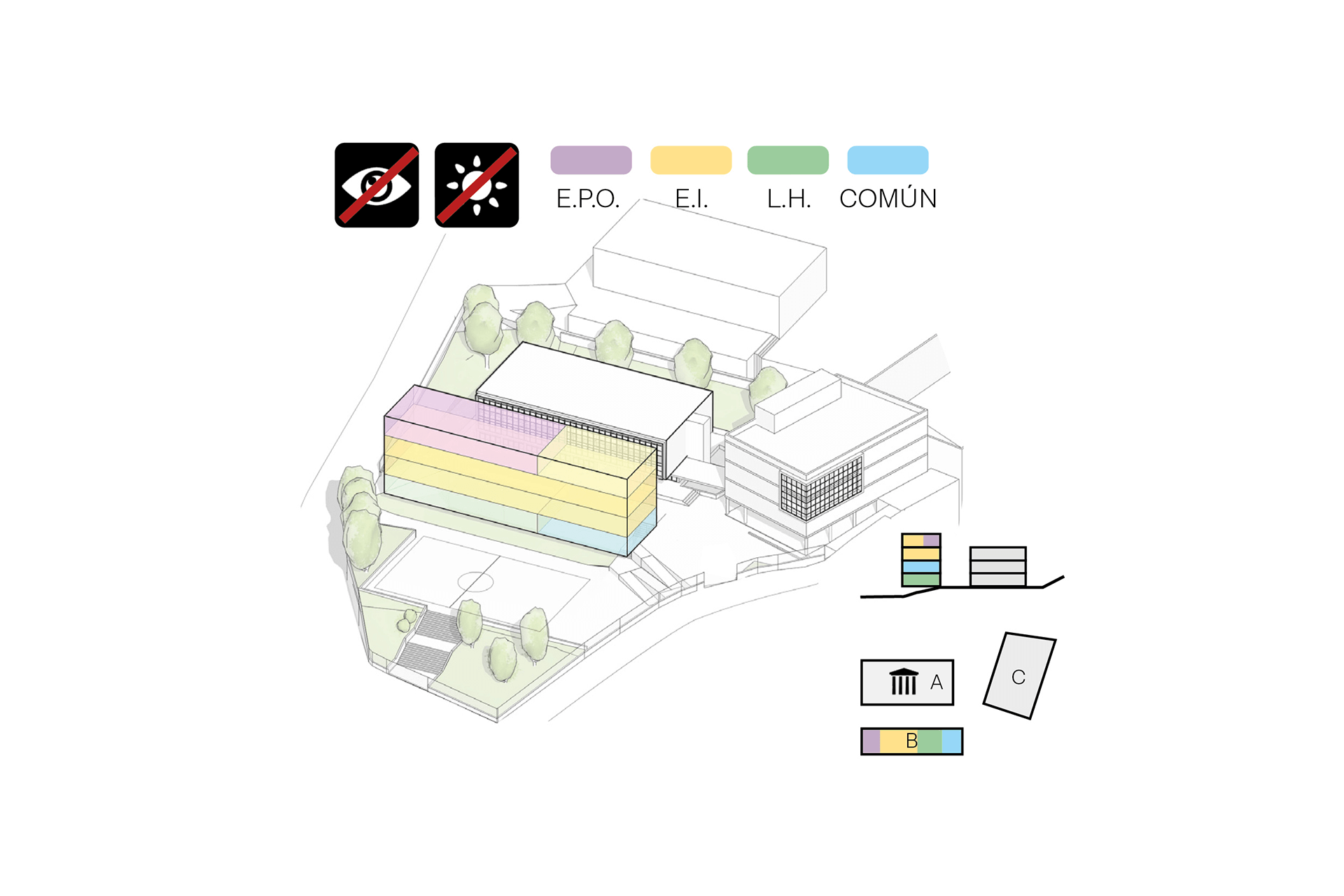 Este nuevo volumen se dispone de forma paralela al edificio existente de Educación Primaria, al cual se adosa una ampliación. Se propone diseñar la relación entre ambos edificios de forma controlada: por un lado, se conectan en la primera planta mediante un volumen transversal que alberga un amplio vestíbulo común; por otro lado, se enlazan en la segunda planta a través del comedor y el gimnasio existentes.