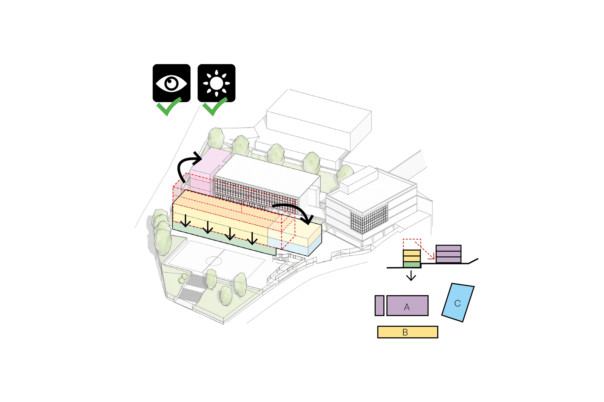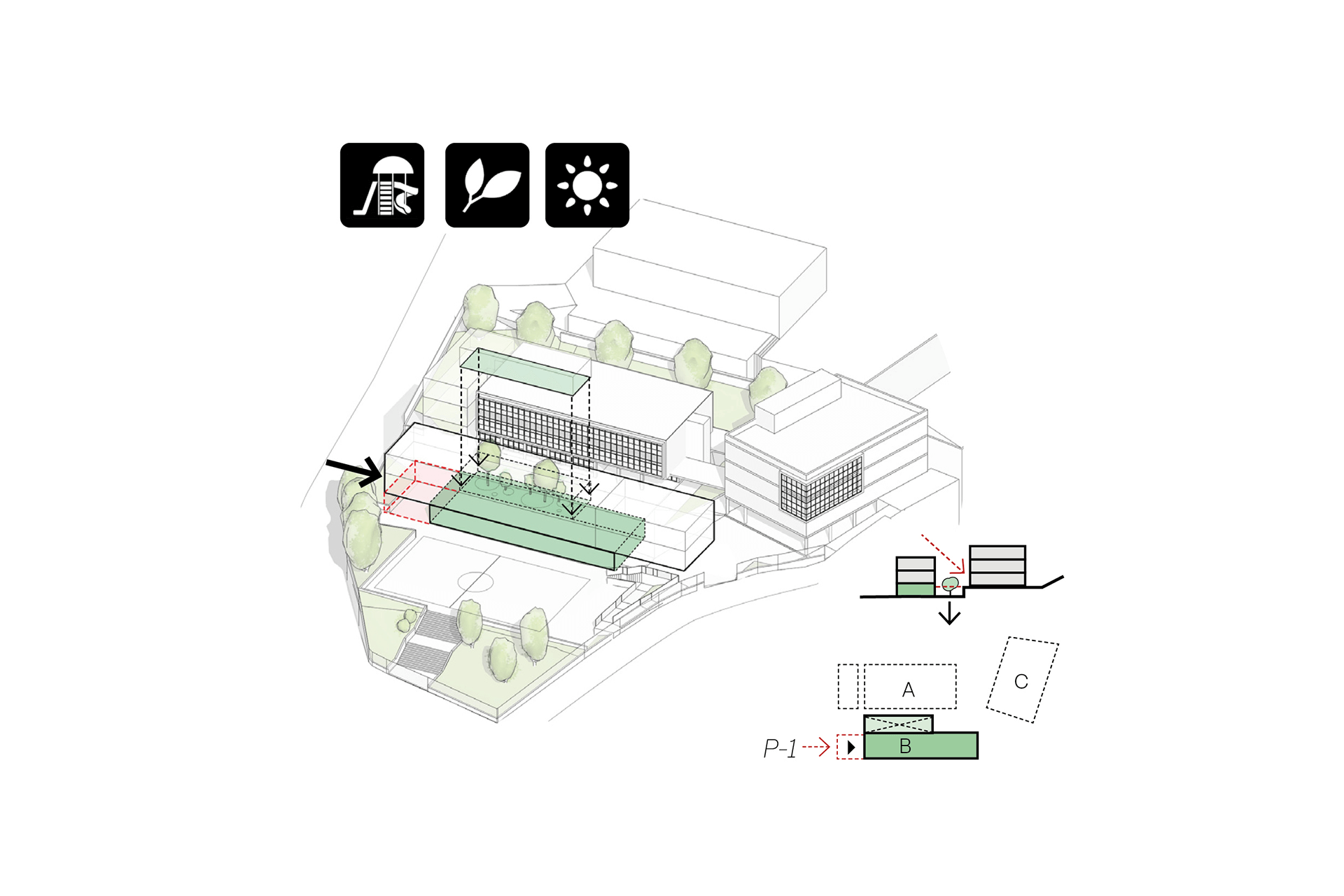 La propuesta se plantea desde la máxima eficiencia, priorizando la flexibilidad programática, la simplicidad constructiva y la economía de medios. Para minimizar los desplazamientos, se agrupan los diferentes usos en los distintos volúmenes, logrando así una mayor eficacia funcional.
