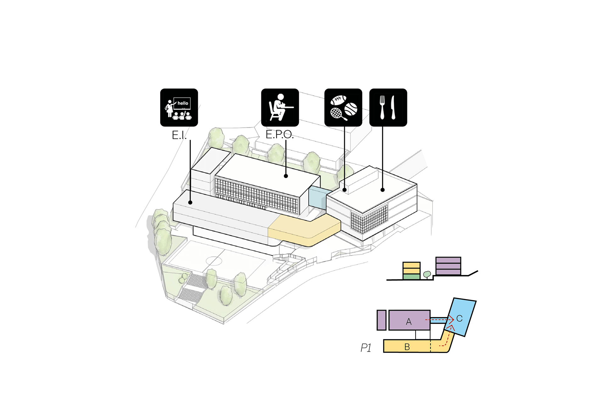Esta estrategia no solo permite minimizar y sectorizar los flujos de circulación —mejorando así la eficiencia general del conjunto—, sino que además asegura que la conexión entre el jardín de infancia y la escuela se produzca siempre en espacios comunes supervisados por el personal del centro.