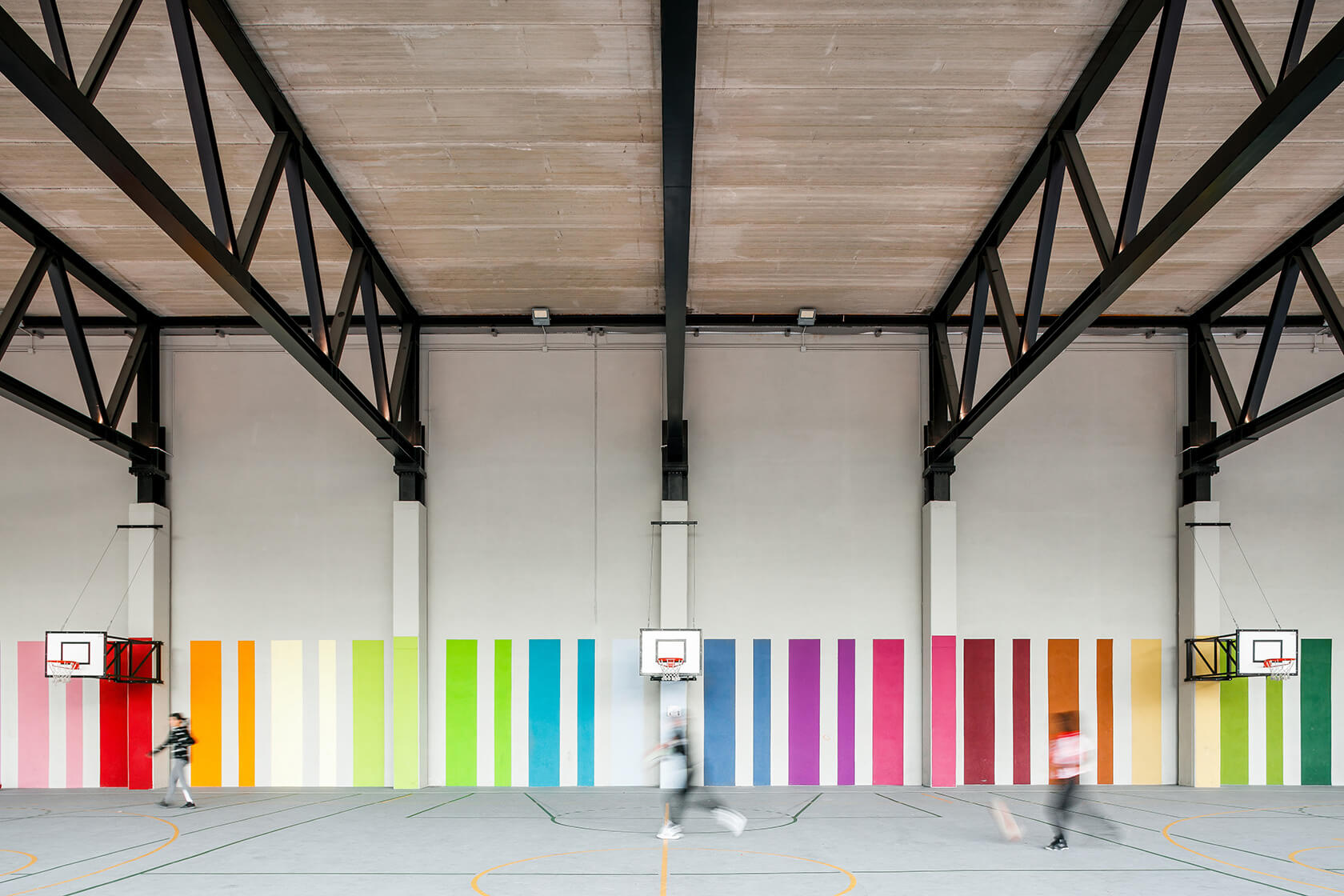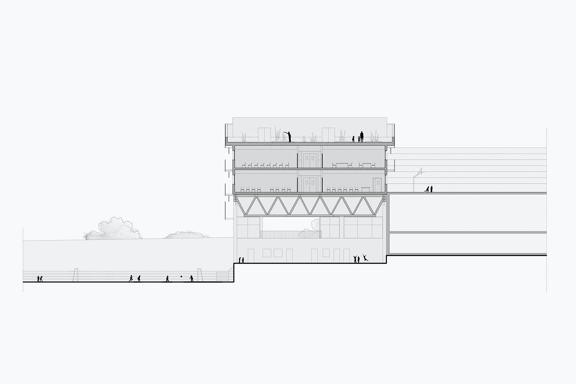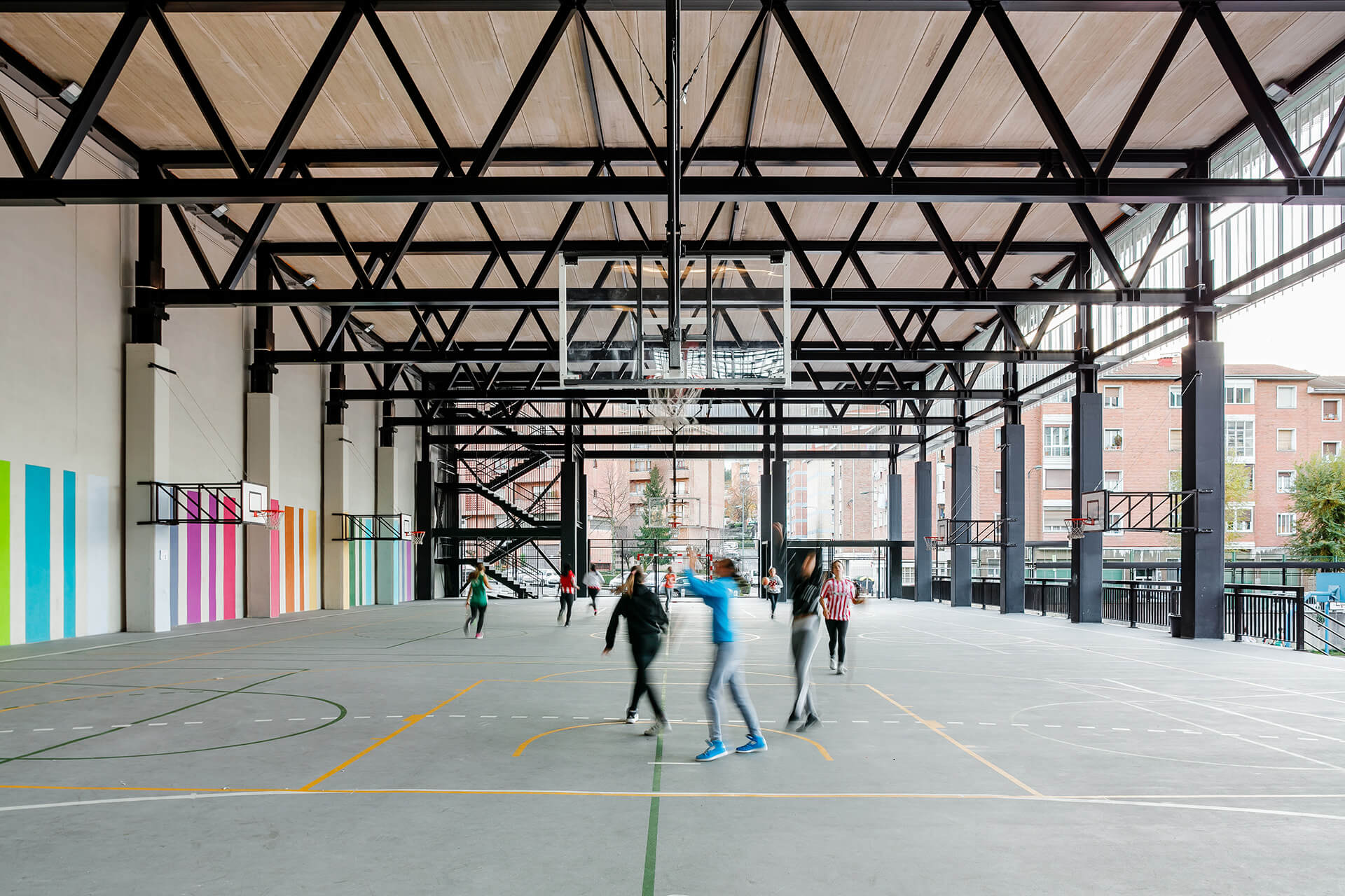 La respuesta a este desafío se materializó en la incorporación de una cancha cubierta bajo el nuevo edificio. De este modo, prácticamente toda el área afectada por las nuevas construcciones se destina a usos deportivos y de recreo, ya sea al aire libre o bajo techo.