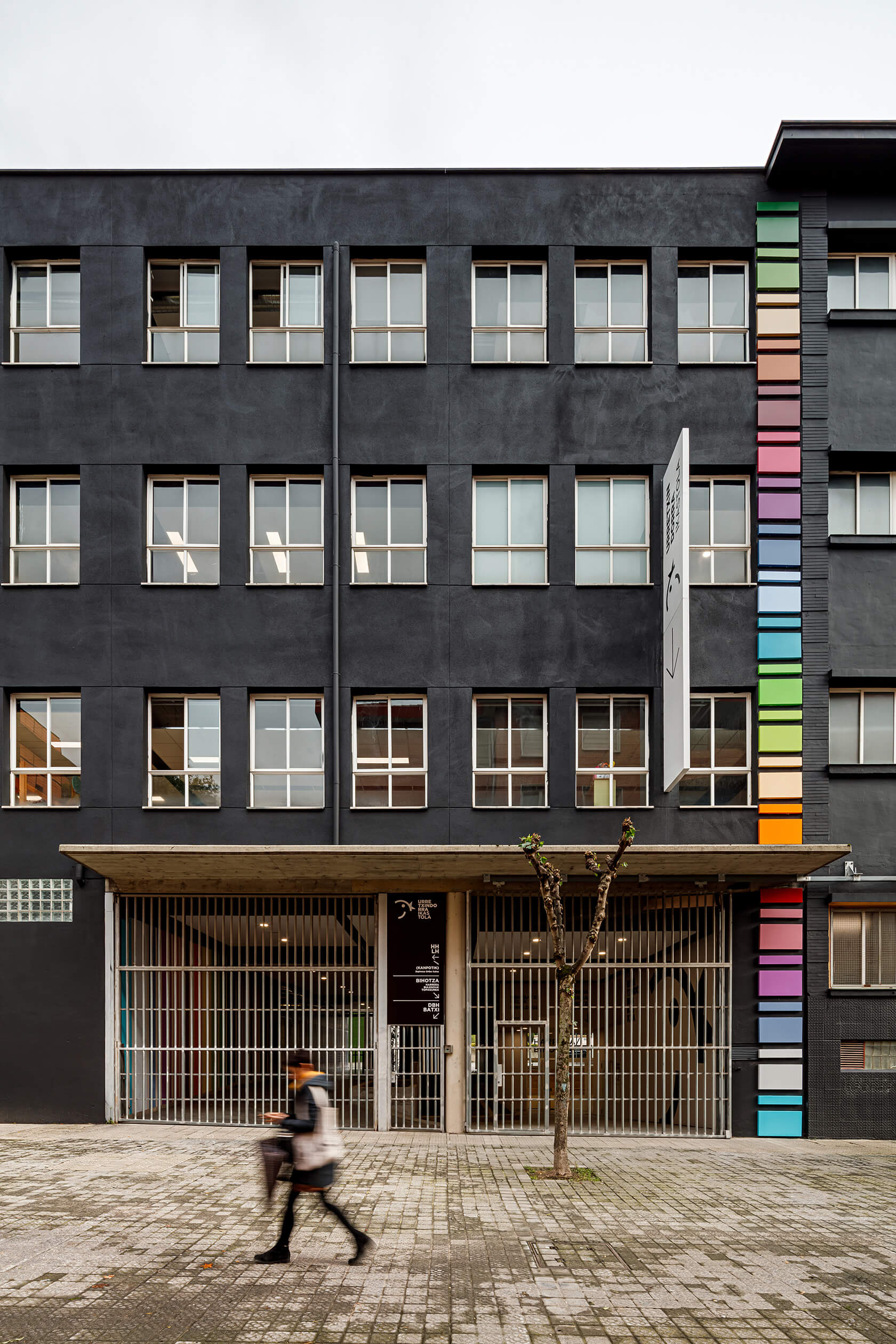 En cuanto a la composición del volumen, se opta por una imagen única que unifica toda la intervención. Tanto las medidas de seguridad del patio como las soluciones de la fachada del nuevo edificio se determinan utilizando los mismos estándares de diseño.