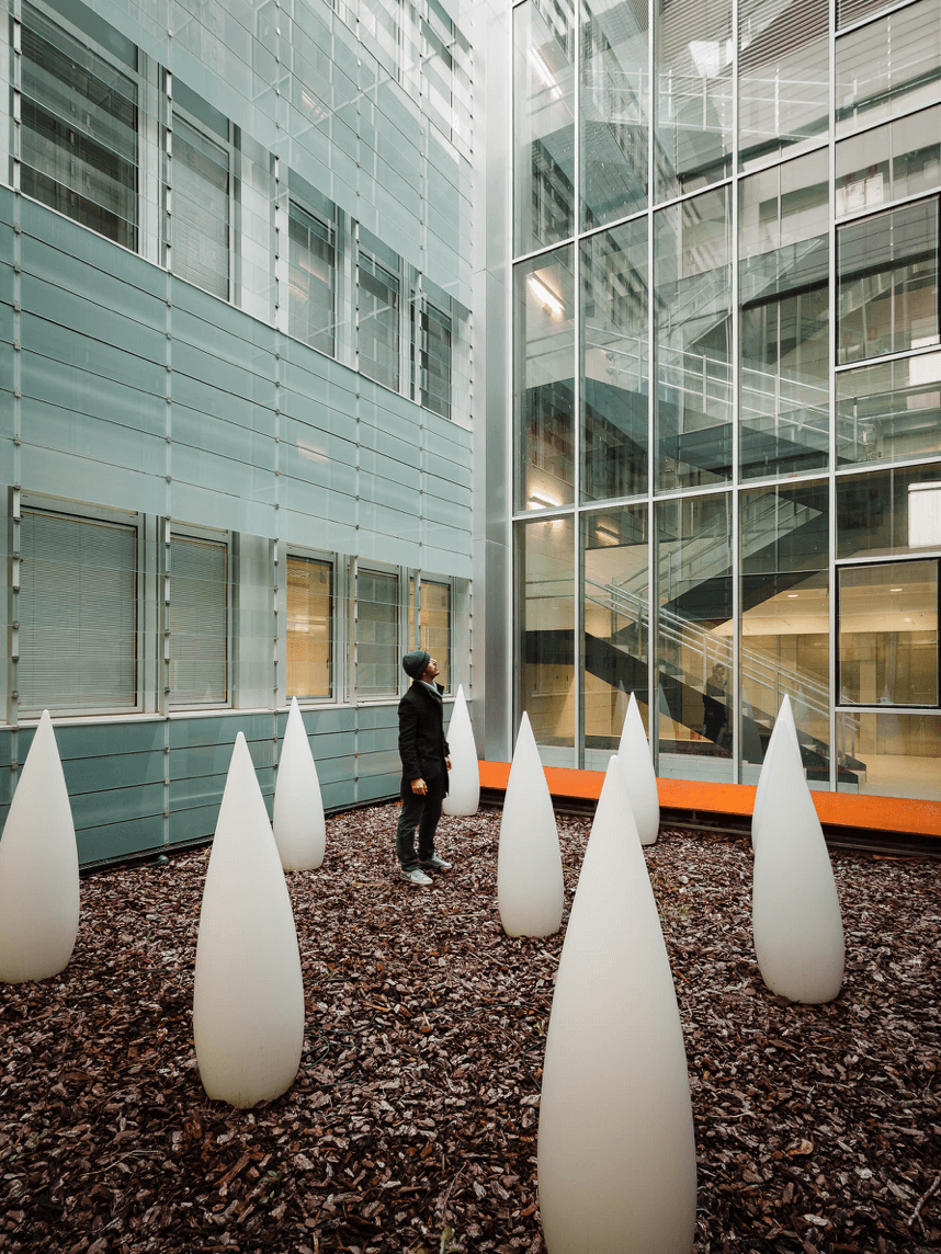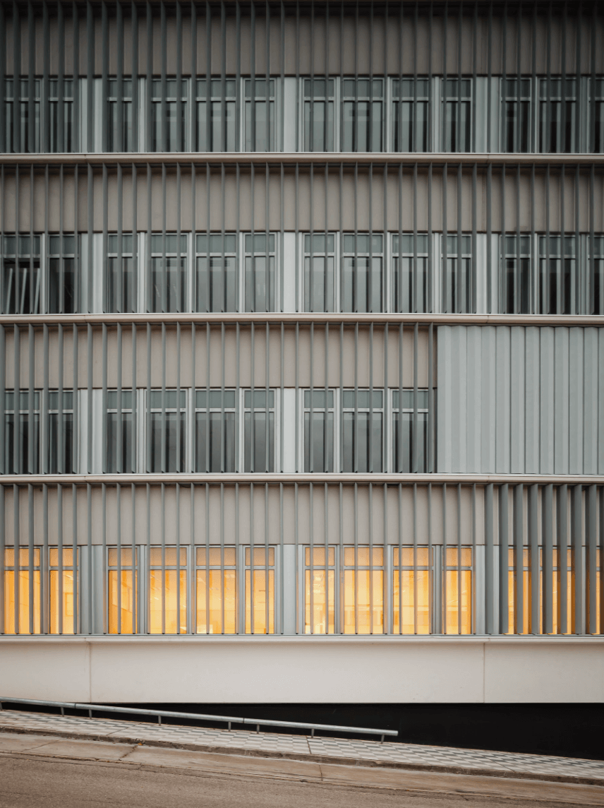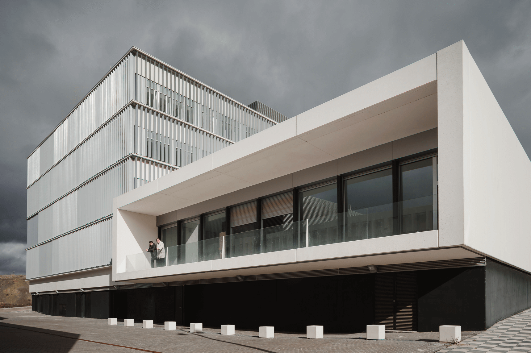 Una fachada contemporánea de lamas de vidrio que garantiza el control solar y aporta una identidad abierta y pública al servicio.