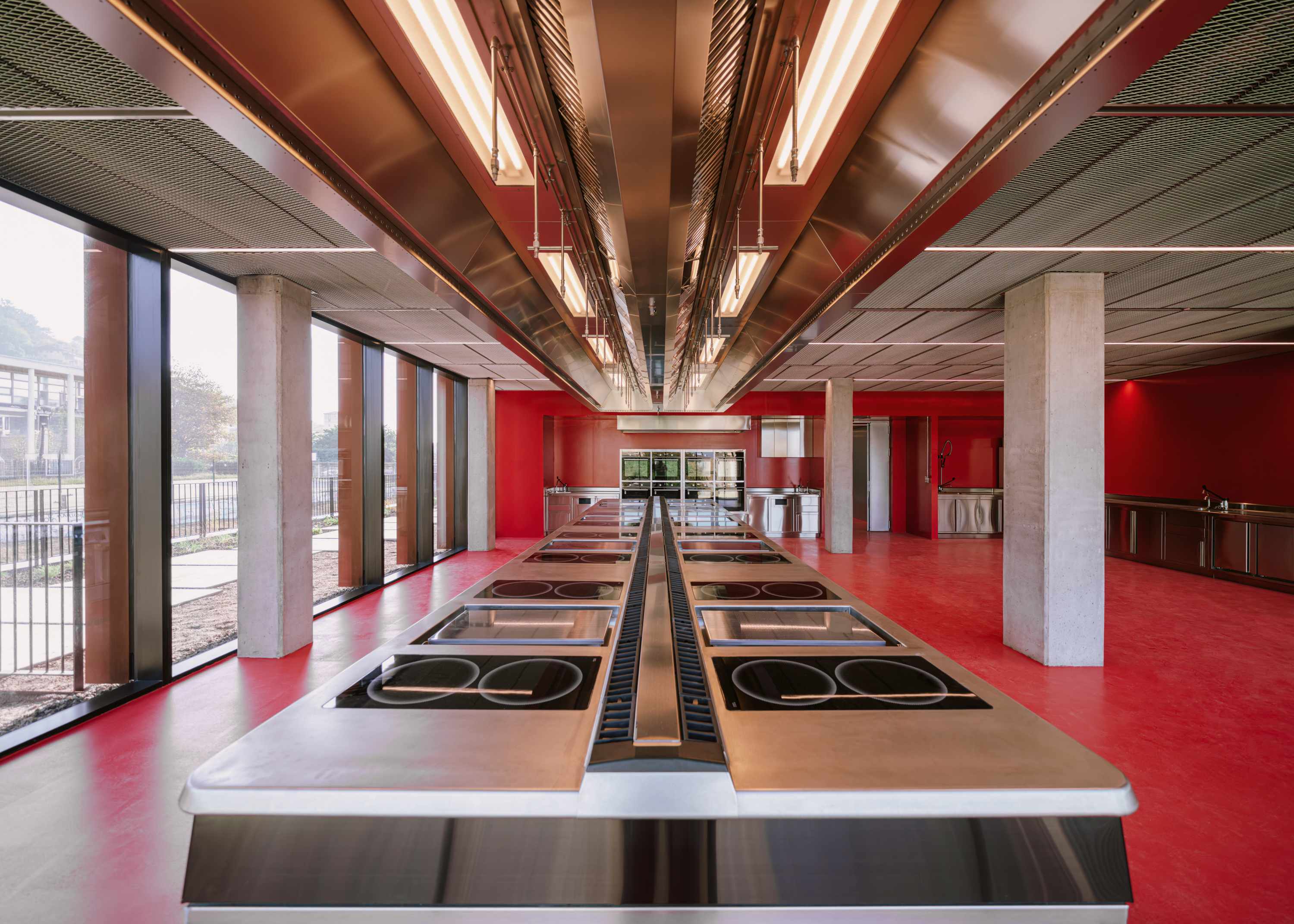 Un edificio que emerge del terreno a través de una gran escalinata que conecta interior y exterior y su fachada con grandes ventanales difumina el límite entre el interior y el exterior. En la cubierta, los niveles se escalonan hacia el mar evocando los flysch característicos de la costa vasca. El edificio ha sido diseñado para adaptarse a programas cambiantes: cocinas experimentales, laboratorios, aulas y espacios de coworking que pueden reconfigurarse gracias a sistemas de suelo técnico y techos porosos. Su fachada ventilada y cubierta vegetal optimizan el confort térmico y reducen la huella de carbono, mientras que la transparencia visual invita a la ciudad a participar del ecosistema gastronómico. El Hall, corazón del edificio, articula los programas de investigación, formación y emprendimiento gastronómico, invitando a la ciudadanía a descubrir el proceso creativo que da forma a la cocina del futuro.