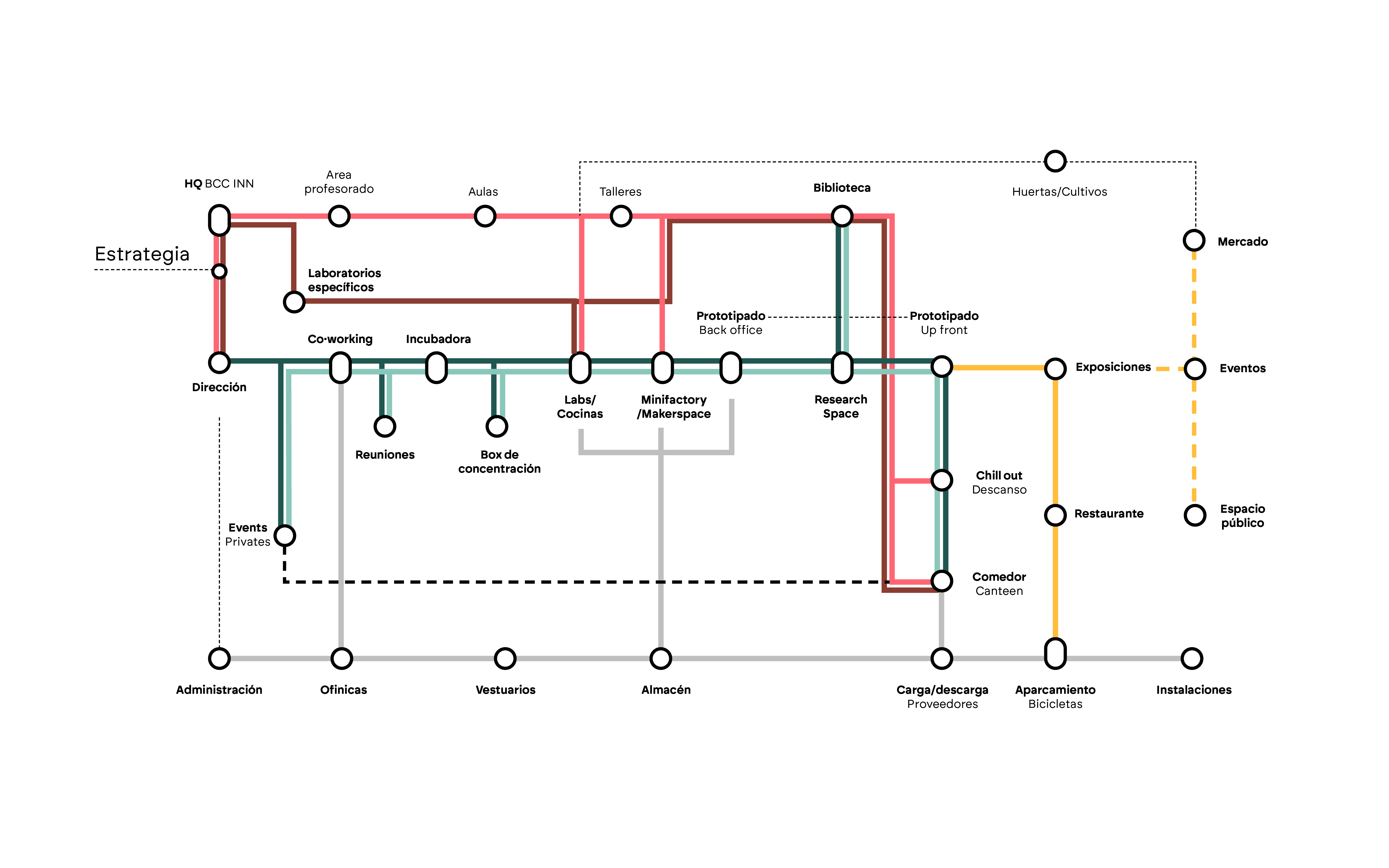 Esta red global de agentes desarrolla sus iniciativas dentro del centro físico gracias a las infraestructuras compartidas que GOe pone a su disposición. El equipo de proyecto, formado por expertos del BCC, BIG y BAT, trabajó con un objetivo común: buscar soluciones innovadoras para generar nuevo valor en toda la cadena gastronómica. Durante el desarrollo, la colaboración entre equipos permitió conceptualizar un espacio que promueve la interacción, la creación y el intercambio de conocimiento, dando forma a un prototipo arquitectónico del futuro.