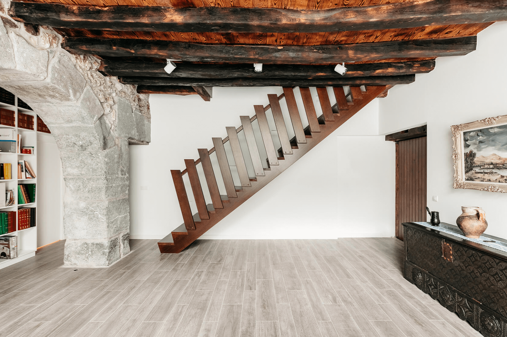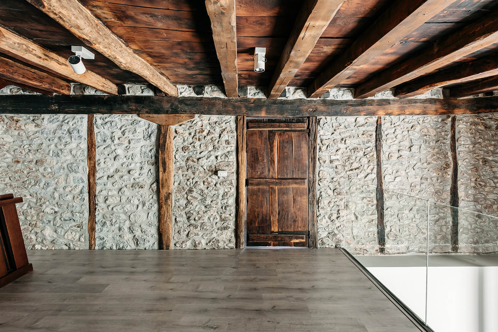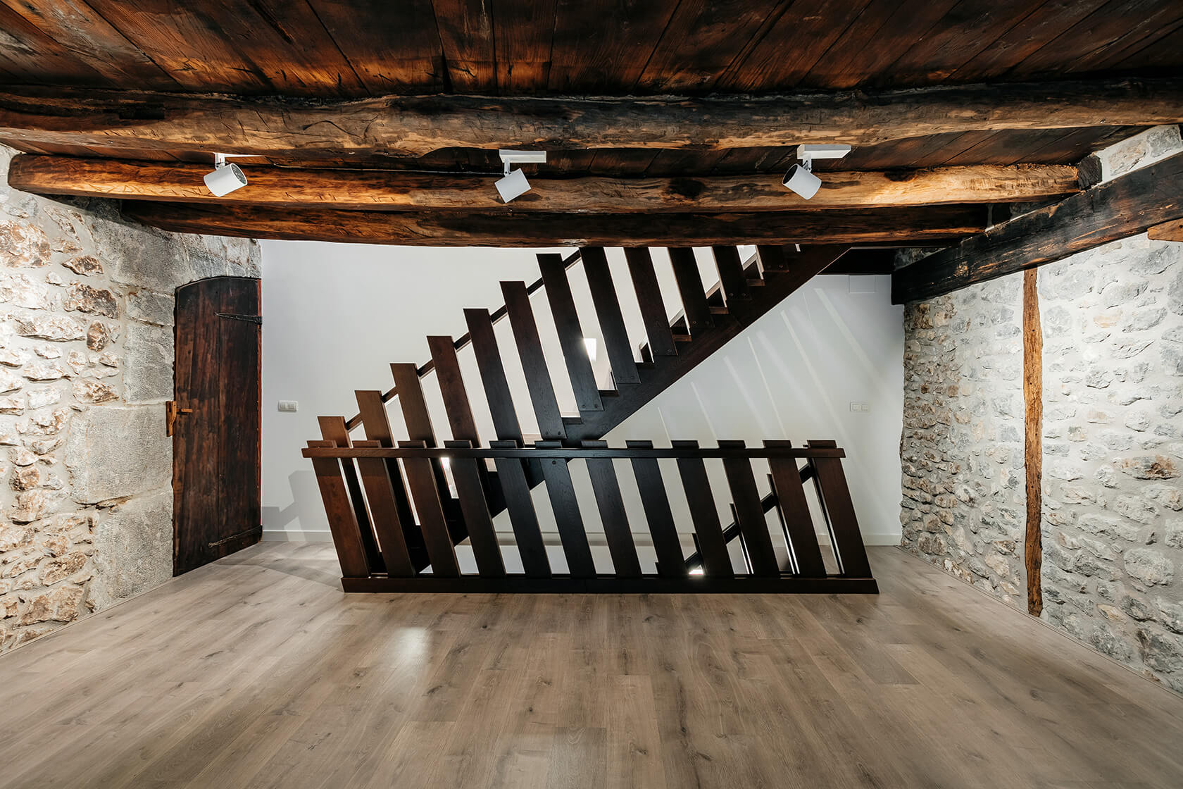 La escalera principal se convierte en el elemento que entrelaza todos los niveles. Comienza en la planta baja, que originalmente albergaba las cuadras y ahora se utiliza como espacios diurnos, y conduce a la segunda planta, destinada todavía a las estancias nocturnas. Finalmente, en la última planta, la antigua cámara de secado ha asumido un nuevo papel como espacio multifuncional.