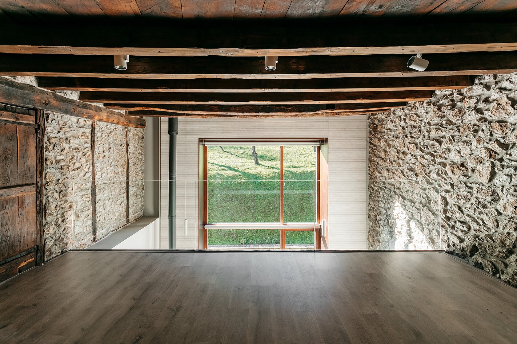 La presencia de muros perimetrales ha limitado el cambio en la configuración espacial del interior. La fachada lateral es donde se ha llevado a cabo la modernización y mejora de la construcción rural, junto con la adaptación a nuevas soluciones y técnicas. La apertura de un gran hueco y el espacio a doble altura han creado una conexión directa entre la casa y el Bosque de Oma. Esta solución habría sido impensable hace décadas, cuando estos robustos edificios de mampostería buscaban minimizar cualquier tipo de pérdida energética, utilizando únicamente pequeños orificios de ventilación en la fachada.