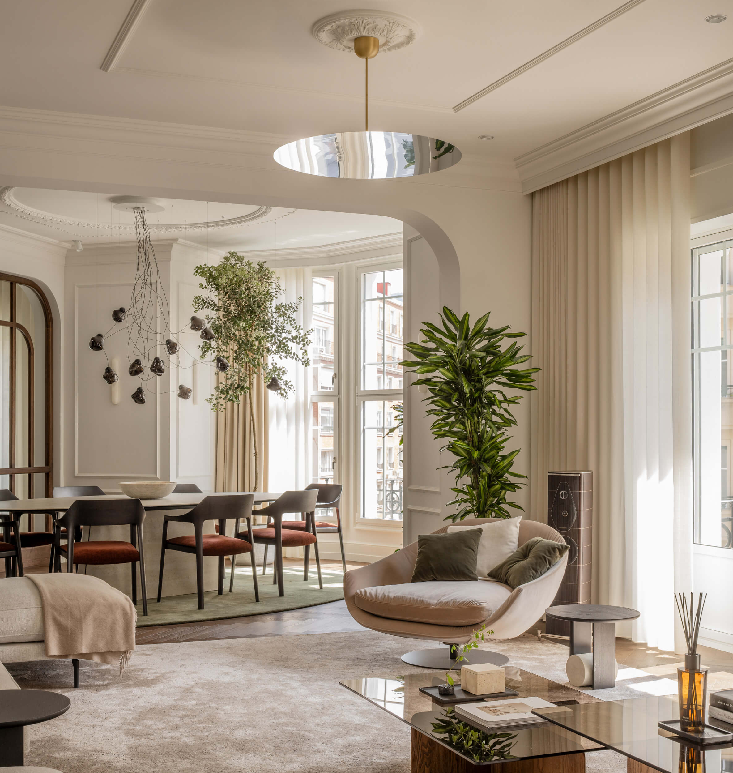 La vivienda se abre a través de un hall concebido como introducción al proyecto. Una lámpara escultórica Bocci 28.13, compuesta por esferas en tonos rojizos, verdes botella y azules Bilbao, recibe a los visitantes y despliega la paleta cromática que matiza cada estancia. Los arcos organizan la circulación y refuerzan la conexión entre espacios, mientras las molduras restauradas conviven con piezas de autor como el aparador Dune y el espejo Levante de Bonaldo. El núcleo social de la vivienda se despliega en un salón inundado de luz natural, donde los ventanales enmarcan la vida urbana y los reflejos de espejos y vidrieras multiplican la percepción espacial. La paleta neutra se ve interrumpida por un sofá rojo de Ditre, gesto escultórico que marca la identidad del espacio.