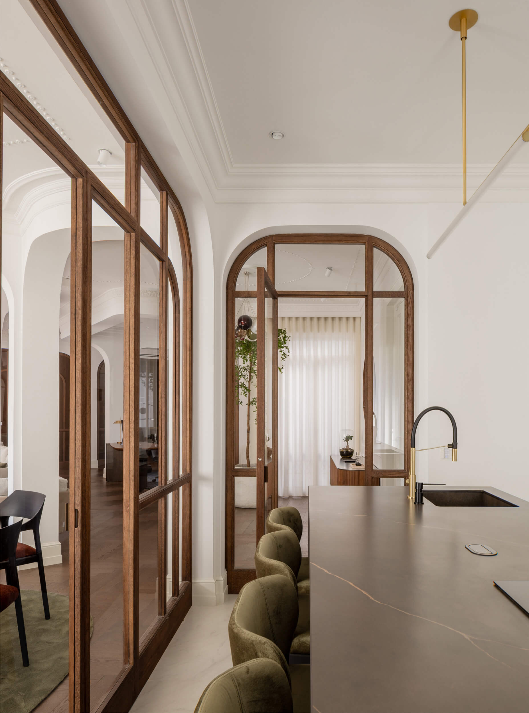 La continuidad fluida conduce al comedor, donde una mesa Cattelan se convierte en el centro bajo la lámpara Bocci 57.13, de carácter abstracto y poético, concebida casi como una instalación artística. El comedor conecta con la cocina a través de carpinterías curvas de madera y vidrio que reinterpretan antiguas particiones. Presidida por una isla central y acompañada por sillas tapizadas en verde, el espacio invita a cocinar, conversar y compartir. La iluminación se completa con la lámpara Ambrosia de Marset. En la zona privada, el dormitorio principal se concibe como refugio. Textiles en tonos arena, un cabecero tapizado y una bañera exenta frente a los ventanales transforman lo cotidiano en ritual de bienestar. El baño en suite refuerza la atmósfera con un bloque de mármol oscuro veteado en dorado y grifería Steinberg.