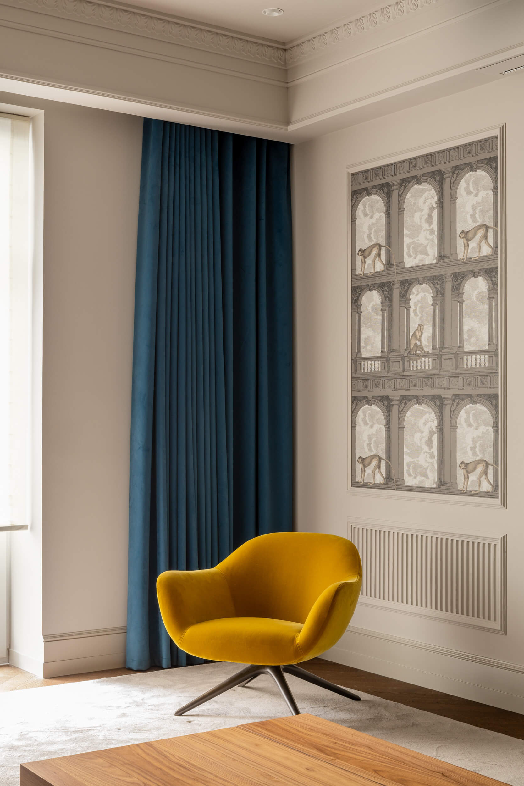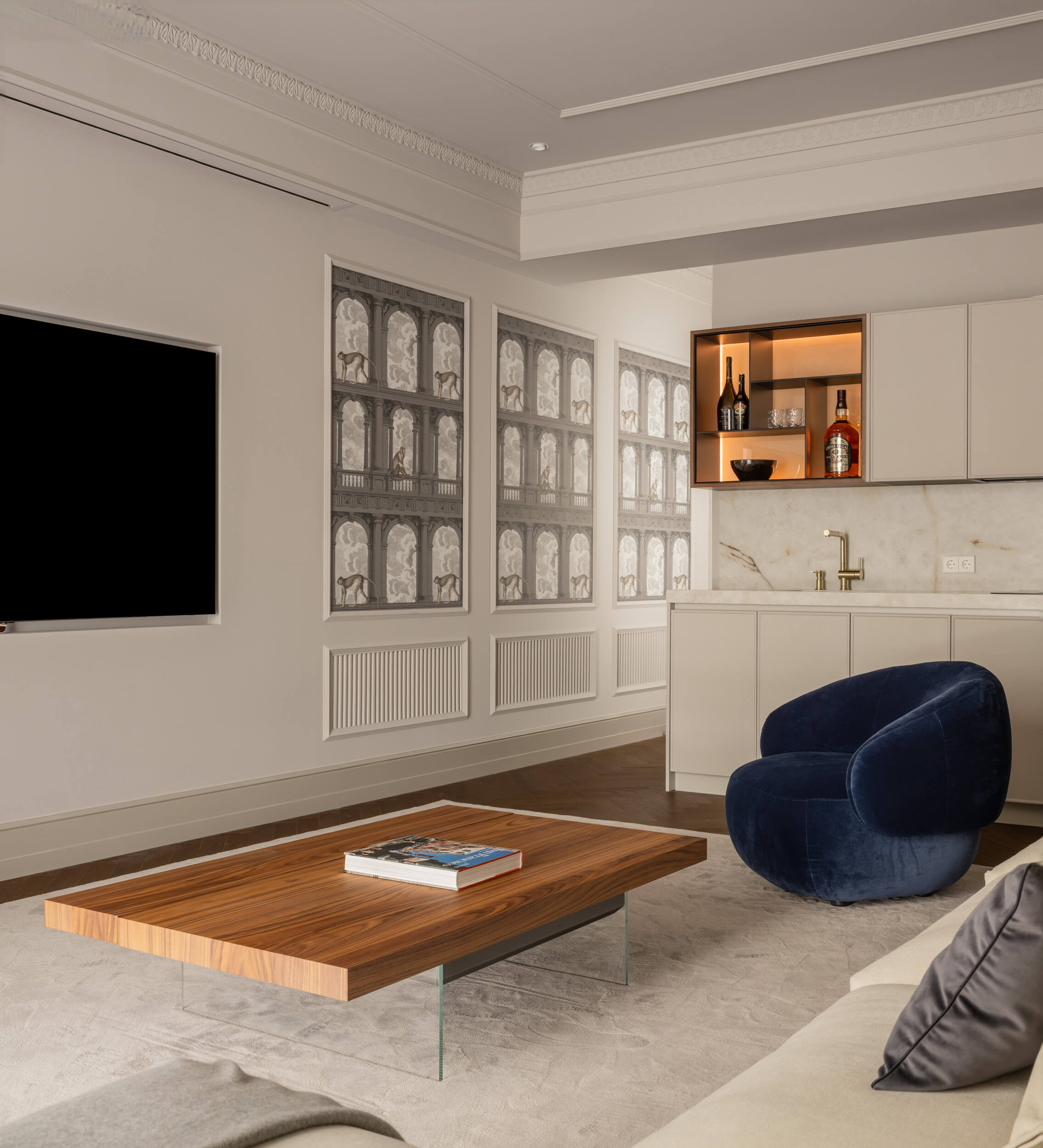 El recorrido culmina en una sala de cine doméstico, equipada con pantalla de gran formato, sistema audiovisual, cocina auxiliar y barra retroiluminada. Papeles pintados de Cole & Son, que representan fachadas clásicas habitadas por animales, introducen un toque lúdico.