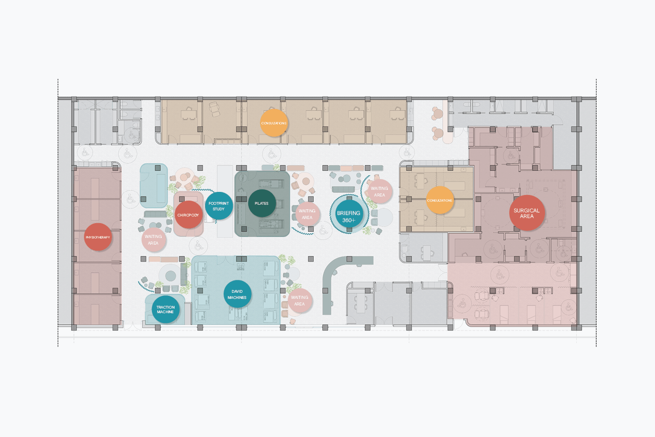 Desde una perspectiva espacial, esta clínica situada en el floreciente centro de salud de Bilbao está meticulosamente diseñada para contar con un área central abierta de carácter público. Dentro de este espacio central, emergen distintas burbujas que sirven como refugios para zonas de espera, áreas de relajación y espacios versátiles. Alrededor de este núcleo central se encuentran las salas de consulta, junto con zonas restringidas como el quirófano y los vestuarios. El espacio central cumple funciones multifuncionales, actuando como un área común de reunión similar a una plaza, ideal para la realización de eventos y para fomentar la interacción profesional.