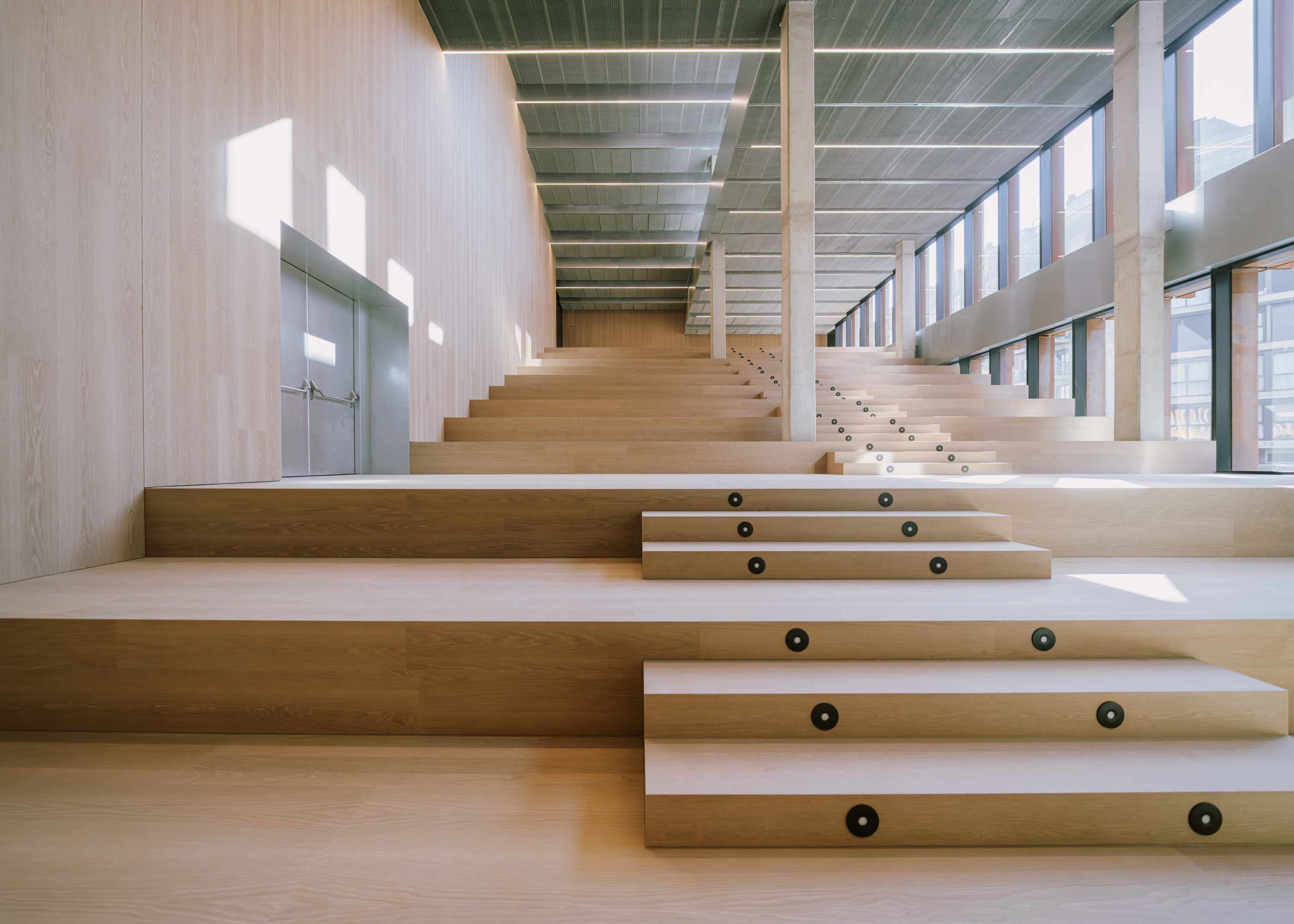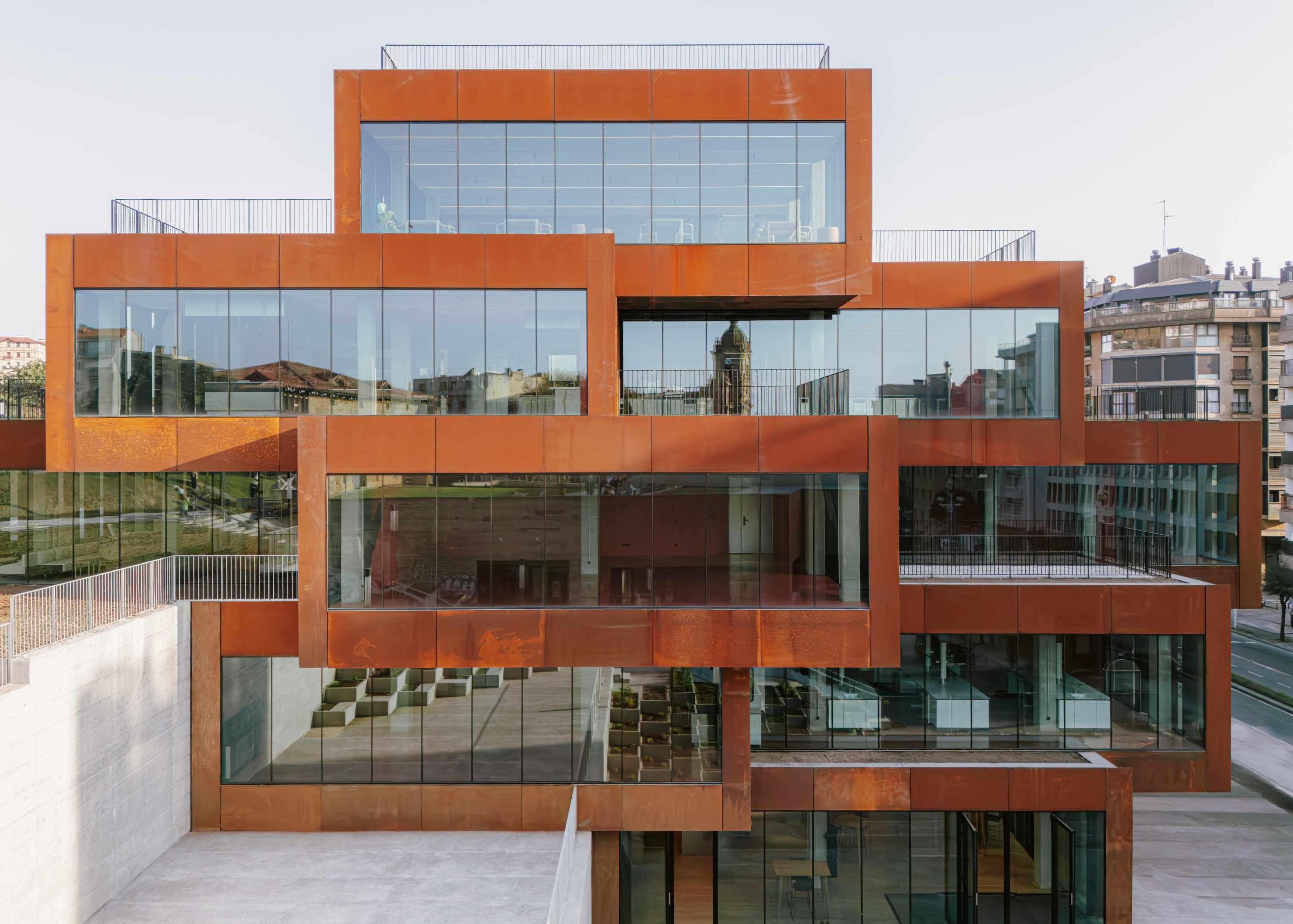 The building rises from the terrain through a generous stairway that connects interior and exterior spaces. Its façade, defined by large glazed openings, softens the boundary between inside and out. On the roof, the volumes step down toward the sea, evoking the flysch formations characteristic of the Basque coastline. Designed to adapt to evolving needs, the building accommodates experimental kitchens, laboratories, classrooms and coworking spaces that can be reconfigured through raised flooring systems and porous ceilings. A ventilated façade and a green roof enhance thermal comfort and reduce the project’s carbon footprint, while visual transparency invites the city to engage with the gastronomic ecosystem.